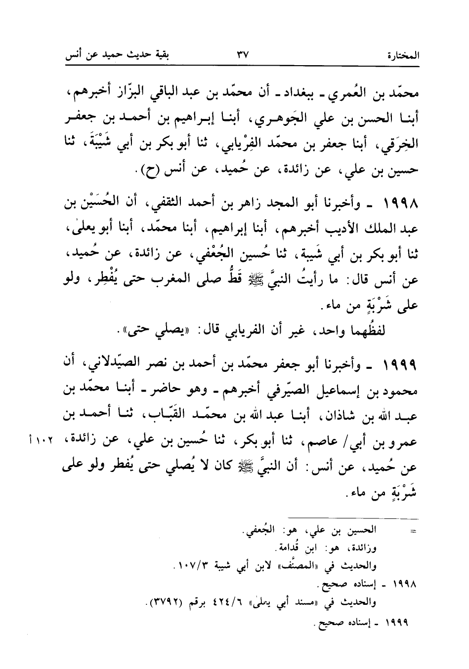 1998 - وَأَخْبَرَنَا أَبُو الْمَجْدِ زَاهِرُ بْنُ أَحْمَدَ الثَّقَفِيُّ أَنَّ الْحُسَيْنَ بْنَ عَبْدِ الْمَلِكِ الأَدِيبَ أَخْبَرَهُمْ أبنا إِبْرَاهِيمُ أبنا مُحَمَّدٌ أبنا أَبُو يَعْلَى ثَنَا أَبُو بَكْرِ بْنُ أَبِي شَيْبَةَ ثَنا حُسَيْنُ الْجُعْفِيُّ عَنْ زَائِدَةَ عَنْ حُمَيْدٍ عَنْ أَنَسٍ قَالَ مَا رَأَيْتُ النَّبِيَّ صَلَّى اللَّهُ عَلَيْهِ وَسَلَّمَ قَطُّ صَلَّى الْمَغْرِبَ حَتَّى يُفْطِرَ وَلَوْ عَلَى شَرْبَةٍ مِنْ مَاءٍ
