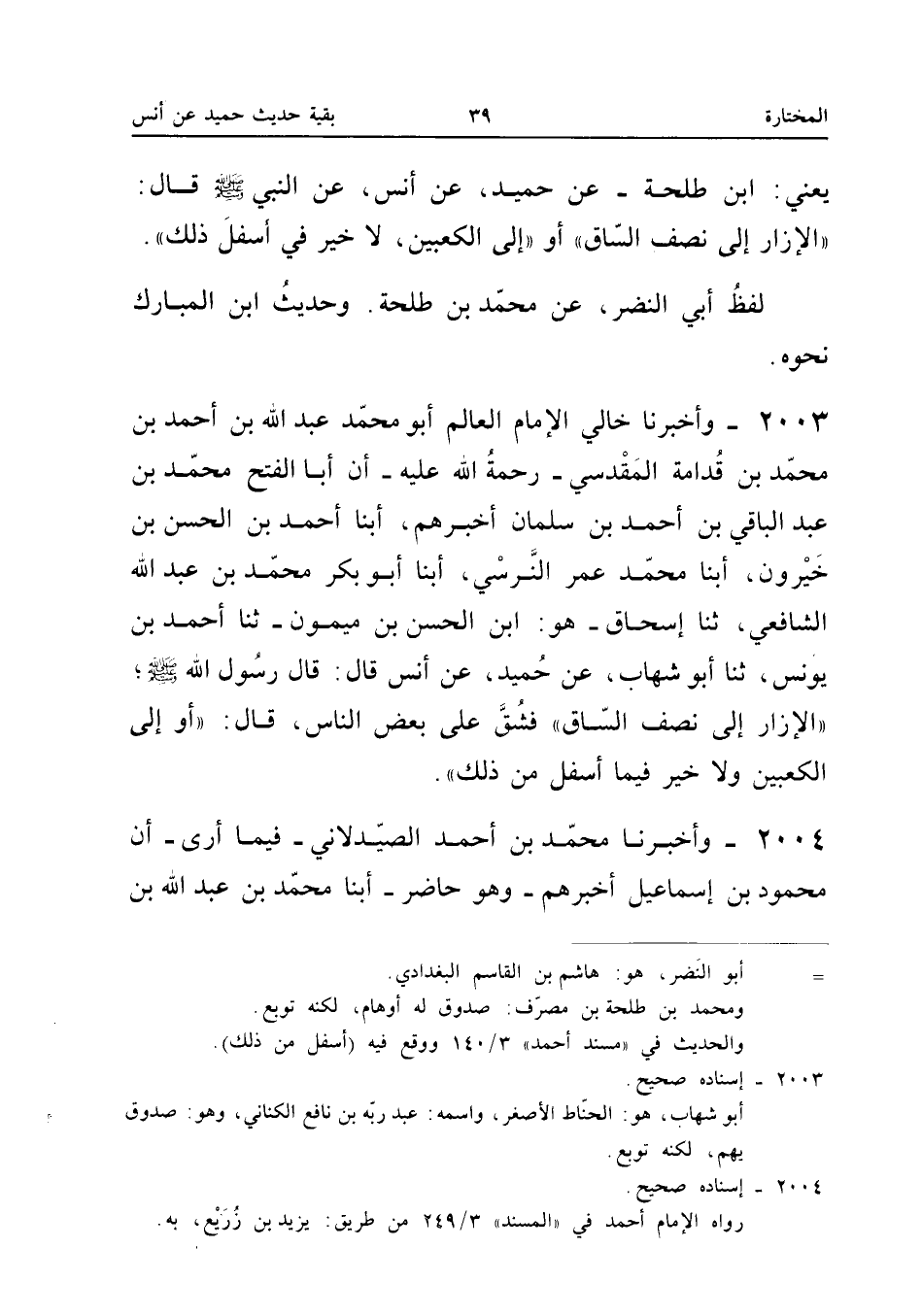 2003 - وَأَخْبَرَنَا خَالِي الإِمَامُ الْعَالِمُ أَبُو مُحَمَّدٍ عَبْدُ اللَّهِ بْنُ أَحْمَدَ بْنِ مُحَمَّدِ بْنِ قُدَامَةَ الْمَقْدِسِيُّ رَحْمَةُ اللَّهِ عَلَيْهِ أَنَّ أَبَا الْفَتْحِ مُحَمَّدَ بْنَ عَبْدِ الْبَاقِي بْنِ أَحْمَدَ بْنِ سَلْمَانَ أَخْبَرَهُمْ أبنا أَحْمَدُ بْنُ الْحَسَنِ بْنِ خيرون أبنا مُحَمَّد عُمَرَ النَّرْسِيُّ أبنا أَبُو بَكْرٍ مُحَمَّدُ بْنُ عَبْدِ اللَّهِ الشَّافِعِيُّ ثَنَا إِسْحَاقُ هُوَ ابْنُ الْحَسَنِ بْنِ مَيْمُونٍ ثَنَا أَحْمَدُ بْنُ يُونُسَ ثَنَا أَبُو شِهَابٍ عَنْ حُمَيْدٍ عَنْ أَنَسٍ قَالَ قَالَ رَسُولُ اللَّهِ صَلَّى اللَّهُ عَلَيْهِ وَسَلَّمَ الإزَارُ إِلَى نِصْفِ السَّاقِ فَشَقَّ عَلَى بَعْضِ النَّاسِ قَالَ أَوْ إِلَى الْكَعْبَيْنِ وَلا خير فِيمَا أَسْفَل من ذَلِك إِسْنَاده صَحِيح