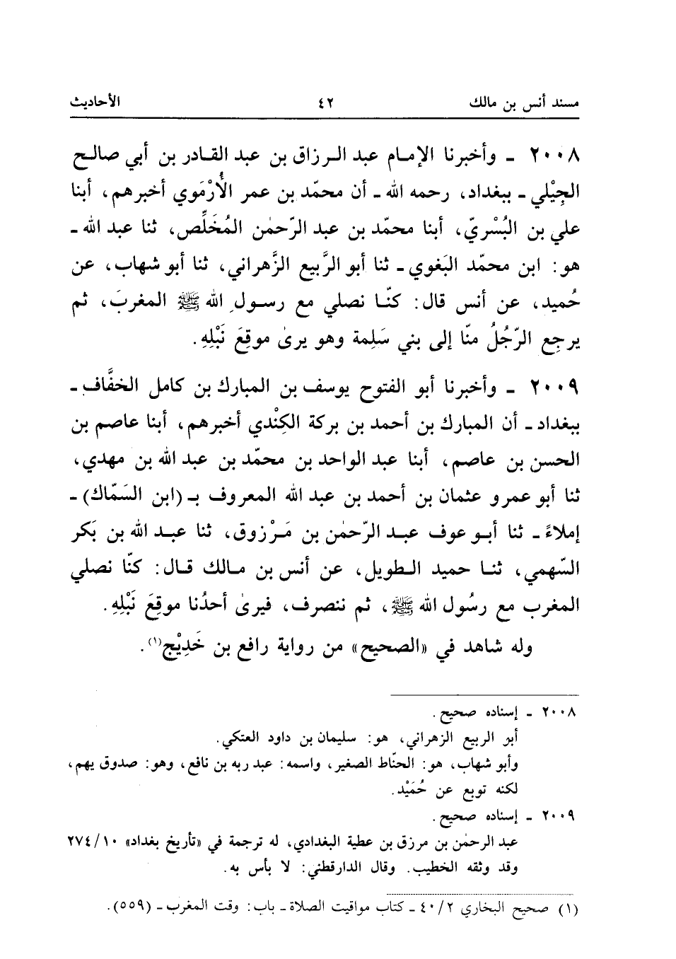 2008 - وَأَخْبَرَنَا الإمَامُ عَبْدُ الرَّزَّاقِ بْنُ عَبْدِ الْقَادِرِ بْنِ أَبِي صَالِحٍ الجِيلِيُّ بِبَغْدَادَ رَحِمَهُ اللَّهُ أَنَّ مُحَمَّدَ بْنَ عُمَرَ الأرْمَوِيَّ أَخْبَرَهُمْ أبنا عَلِيُّ بْنُ الْبُسْرِيِّ أبنا مُحَمَّدُ بْنُ عَبْدِ الرَّحْمَنِ الْمُخَلِّصُ ثَنَا عَبْدُ اللَّهِ هُوَ ابْنُ مُحَمَّدٍ الْبَغَوِيُّ ثَنَا أَبُو الرَّبِيعِ الزَّهْرَانِيُّ ثَنَا أَبُو شِهَابٍ عَنْ حُمَيْدٍ عَنْ أَنَسٍ قَالَ كُنَّا نُصَلِّي مَعَ رَسُولِ اللَّهِ صَلَّى اللَّهُ عَلَيْهِ وَسَلَّمَ الْمَغْرِبَ ثُمَّ يَرْجِعُ الرَّجُلُ مِنَّا إِلَى بَنِي سَلَمَةَ وَهُوَ يَرَى مَوْقِعَ نَبْلِهِ إِسْنَاده صَحِيح