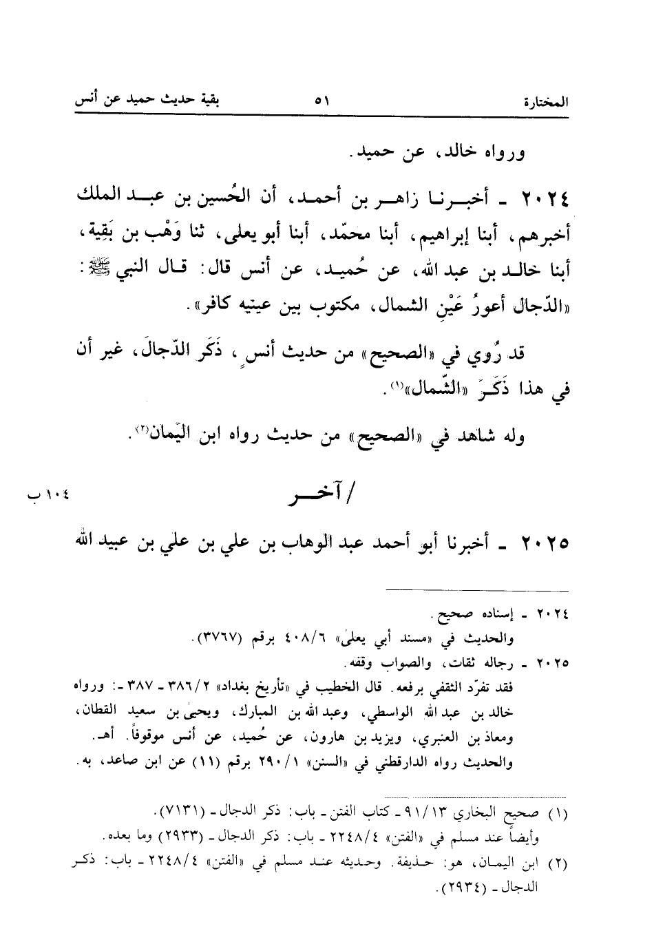 2024 - أَخْبَرَنَا زَاهِرُ بْنُ أَحْمَدَ أَنَّ الْحُسَيْنَ بْنَ عَبْدِ الْمَلِكِ أَخْبَرَهُمْ أبنا إِبْرَاهِيمُ أبنا مُحَمَّدٌ أبنا أَبُو يَعْلَى ثَنَا وَهْبُ بْنُ بَقِيَّةَ أبنا خَالِدُ بْنُ عَبْدِ اللَّهِ عَنْ حُمَيْدٍ عَنْ أَنَسٍ قَالَ قَالَ النَّبِيُّ صَلَّى اللَّهُ عَلَيْهِ وَسَلَّمَ الدَّجَّالُ أَعْوَرُ عَيْنِ الشِّمَالِ مَكْتُوبٌ بَيْنَ عَيْنَيْهِ كَافِرٌ