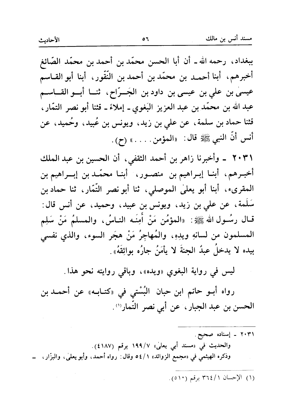 2031 - وَأَخْبَرَنَا زَاهِرُ بْنُ أَحْمَدَ الثَّقَفِيُّ أَنَّ الْحُسَيْنَ بْنَ عَبْدِ الْمَلِكِ أَخْبَرَهُمْ أبنا إِبْرَاهِيمُ بْنُ مَنْصُور أبنا مُحَمَّدُ بْنُ إِبْرَاهِيمَ بْنِ الْمُقْرِئِ أبنا أَبُو يَعْلَى الْمَوْصِلِيُّ ثَنَا أَبُو نَصْرٍ التَّمَّارُ ثَنَا حَمَّادُ بْنُ سَلَمَةَ عَنْ عَلِيِّ بْنِ زَيْدٍ وَيُونُسَ بْنِ عُبَيْدٍ وَحُمَيْدٍ عَنْ أَنَسٍ قَالَ قَالَ رَسُولُ اللَّهِ صَلَّى اللَّهُ عَلَيْهِ وَسَلَّمَ الْمُؤْمِنُ مَنْ أَمِنَهُ النَّاسُ وَالْمُسْلِمُ مَنْ سَلِمَ الْمُسْلِمُونَ مِنْ لِسَانِهِ وَيَدِهِ وَالْمُهَاجِرُ مَنْ هَجَرَ السُّوءَ وَالَّذِي نَفْسِي بِيَدِهِ لَا يَدْخُلُ عَبْدٌ الْجَنَّةَ لَا يَأْمَنُ جَارُهُ بَوَائِقَهُ