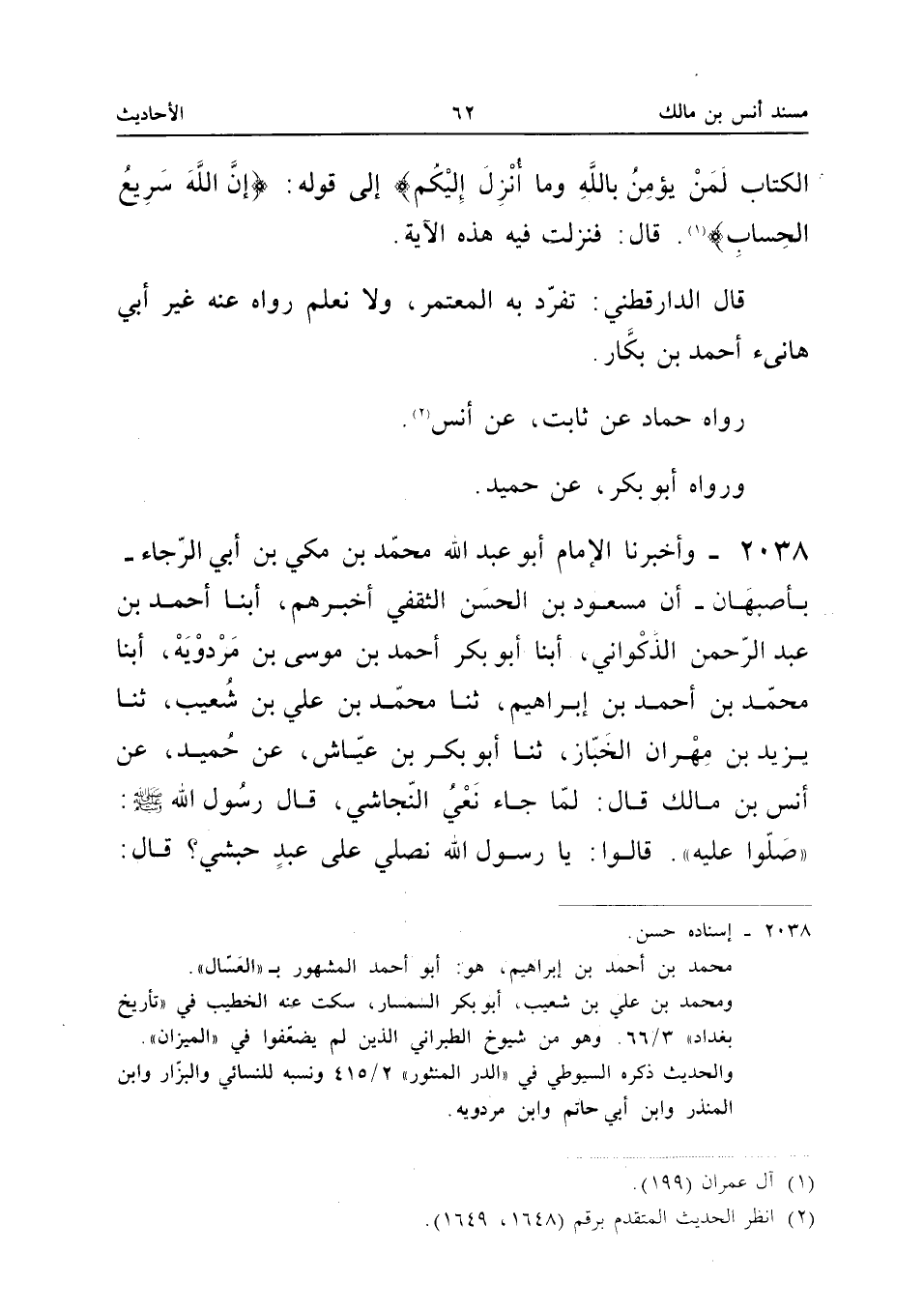 2038 - وَأَخْبَرَنَا الإِمَامُ أَبُو عَبْدِ اللَّهِ مُحَمَّدُ بْنُ مَكِّيِّ بْنِ أَبِي الرَّجَاءِ بِأَصْبَهَانَ أَنَّ مَسْعُودَ بْنَ الْحَسَنِ الثَّقَفِيَّ أَخْبَرَهُمْ أبنا أَحْمَدُ بْنُ عَبْدِ الرَّحْمَنِ الذَّكْوَانِيُّ أبنا أَبُو بَكْرٍ أَحْمَدُ بْنُ مُوسَى بْنِ مَرْدُوَيْهِ أبنا مُحَمَّدُ بْنُ أَحْمَدَ بْنِ إِبْرَاهِيمَ ثَنَا مُحَمَّدُ بْنُ عَلِيِّ بْنِ شُعَيْبٍ ثَنَا يَزِيدُ بْنُ مِهْرَانَ الْخَبَّازُ ثَنَا أَبُو بَكْرِ بْنُ عَيَّاشٍ عَنْ حُمَيْدٍ عَنْ أَنَسِ بْنِ مَالِكٍ قَالَ لَمَّا جَاءَ نَعْيُ النَّجَاشِيِّ قَالَ رَسُولُ اللَّهِ صَلَّى اللَّهُ عَلَيْهِ وَسَلَّمَ صَلُّوا عَلَيْهِ قَالُوا يَا رَسُولَ اللَّهِ نُصَلِّي عَلَى عَبْدٍ حَبَشِيٍّ قَالَ