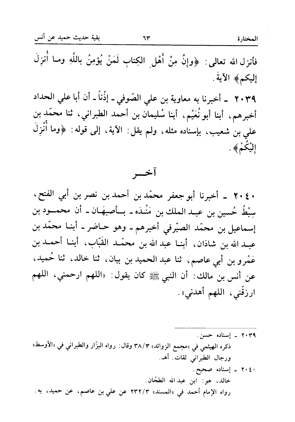 2040 - أَخْبَرَنَا أَبُو جَعْفَرٍ مُحَمَّدُ بْنُ أَحْمَدَ بْنِ نَصْرِ بْنِ أَبِي الْفَتْحِ سِبْطُ حُسَيْنِ بْنِ عَبْدِ الْمَلِكِ بْنِ مَنْدَهْ بِأَصْبَهَانَ أَنَّ مَحْمُودَ بْنَ إِسْمَاعِيلَ بْنِ مُحَمَّدٍ الصَّيْرَفِيَّ أخبرهُمْ وَهُوَ حَاضِرٌ أبنا مُحَمَّدُ بْنُ عَبْدِ اللَّهِ بْنِ شَاذَانَ أبنا عَبْدُ اللَّهِ بْنُ مُحَمَّدٍ الْقَبَّابُ أبنا أَحْمَدُ بْنُ عَمْرِو بْنِ أَبِي عَاصِمٍ ثَنَا عَبْدُ الْحَمِيدِ بْنُ بَيَانٍ ثَنَا خَالِدٌ ثَنَا حُمَيْدٌ عَنْ أَنَسِ بْنِ مَالِكٍ أُنَّ النَّبِيَّ صَلَّى اللَّه عَلَيْهِ وَسَلَّمَ كَانَ يَقُولُ اللَّهُمَّ ارْحَمْنِي اللَّهُمَّ ارْزُقْنِي اللَّهُمَّ اهْدِنِي