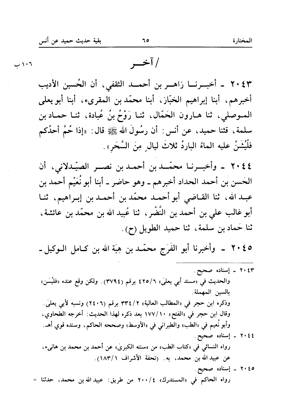 2043 - أَخْبَرَنَا زَاهِرُ بْنُ أَحْمَدَ الثَّقَفِيُّ أَنَّ الْحُسَيْنَ الأدِيبَ أَخْبَرَهُمْ أبنا إِبْرَاهِيمُ الخَبَّازُ أبنا مُحَمَّدٌ بن الْمُقْرِئِ أبنا أَبُو يَعْلَى الْمَوْصِلِيُّ ثَنَا هَارُونُ الْحَمَّالُ ثَنَا رَوْحُ بْنُ عُبَادَةَ ثَنَا حَمَّادُ بْنُ سَلَمَةَ قثنا حُمَيْدٌ عَنْ أَنَسٍ أَنَّ رَسُولَ اللَّهِ صَلَّى اللَّهُ عَلَيْهِ وَسَلَّمَ قَالَ إِذَا حُمَّ أَحَدُكُمْ فَلْيَشُنَّ عَلَيْهِ الْمَاءَ الْبَارِدَ ثَلَاث لَيَال من السحر إِسْنَاده صَحِيح
