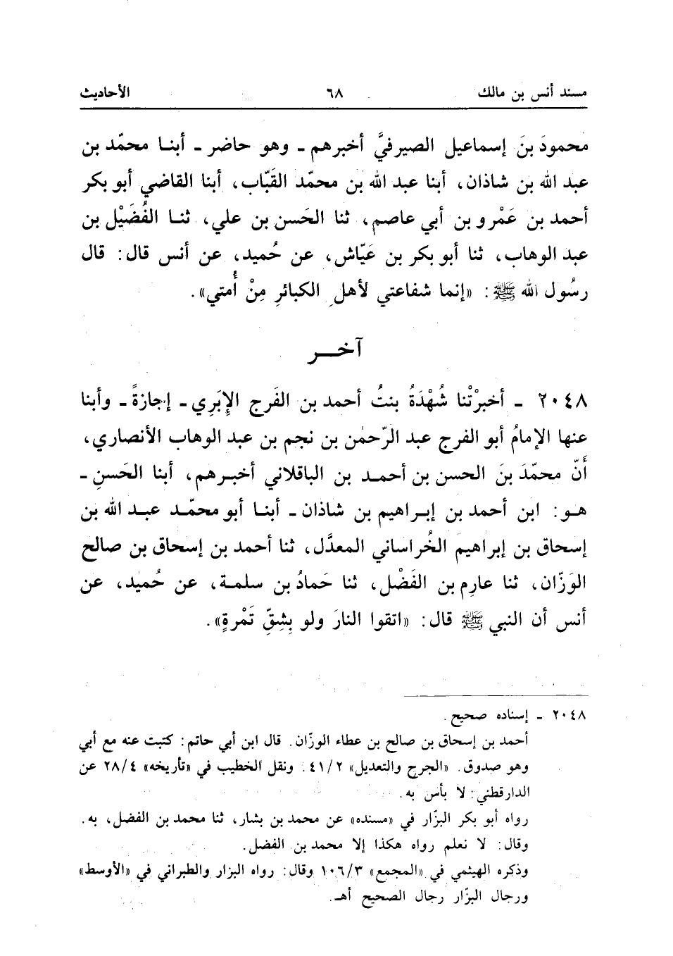 2048 - أَخْبَرَتْنَا شُهْدَةُ بِنْتُ أَحْمَدَ بْنِ الْفَرَجِ الإبَرِيُّ إِجَازَةً وَأبنا عَنْهَا الإمَامُ أَبُو الْفَرَجِ عَبْدُ الرَّحْمَنِ بْنُ نَجْمِ بْنِ عَبْدِ الْوَهَّابِ الأنْصَارِيُّ أَنَّ مُحَمَّدَ بْنَ الْحَسَنِ بْنِ أَحْمَدَ بْنِ الْبَاقِلانِيِّ أَخْبَرَهُمْ أبنا الْحَسَنُ هُوَ ابْنُ أَحْمَدَ بْنِ إِبْرَاهِيمَ بْنِ شَاذَانَ أبنا أَبُو مُحَمَّدٍ عَبْدُ اللَّهِ بْنُ إِسْحَاقَ بْنِ إِبْرَاهِيمَ الْخُرَاسَانِيُّ الْمُعَدَّلُ ثَنَا أَحْمَدُ بْنُ إِسْحَاقَ بْنِ صَالِحٍ الْوَزَّانُ ثَنَا عَارِمُ بْنُ الْفَضْلِ ثَنَا حَمَّادُ بْنُ سَلَمَةَ عَنْ حُمَيْدٍ عَنْ أَنَسٍ أَنَّ النَّبِيَّ صَلَّى اللَّهُ عَلَيْهِ وَسَلَّمَ قَالَ اتَّقُوا النَّار وَلَو بشق تَمْرَة
