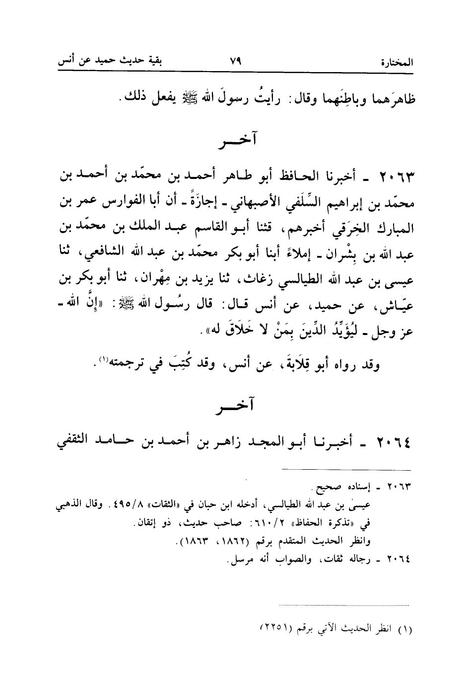 2063 - أَخْبَرَنَا الْحَافِظُ أَبُو طَاهِرٍ أَحْمَدُ بْنُ مُحَمَّدٍ بْنِ أَحْمَدَ بْنِ مُحَمَّدِ بْنِ إِبْرَاهِيمَ السِّلَفِيُّ الأَصْبَهَانِيُّ إِجَازَةً أَنَّ أَبَا الْفَوَارِسِ عُمَرَ بْنَ الْمُبَارَكِ الْخِرَقِيَّ أَخْبَرَهُمْ قثنا أَبُو الْقَاسِمِ عَبْدُ الْمَلِكِ بْنُ مُحَمَّدِ بْنِ عَبْدِ اللَّهِ بْنِ بِشْرَانَ إِمْلاءً أبنا أَبُو بَكْرٍ مُحَمَّدُ بْنُ عَبْدِ اللَّهِ الشَّافِعِيُّ ثَنَا عِيسَى بْنُ عَبْدِ اللَّهِ الطَّيَالِسِيُّ زغاث ثَنَا يَزِيدُ بْنُ مِهْرَانَ ثَنَا أَبُو بَكْرِ بْنُ عَيَّاشٍ عَنْ حُمَيْدٍ عَنْ أَنَسٍ قَالَ قَالَ رَسُولُ اللَّهِ صَلَّى اللَّه عَلَيْهِ وَسَلَّمَ إِنَّ اللَّهَ عَزَّ وَجَلَّ لَيُؤَيِّدُ الدِّينَ بِمَنْ لَا خَلاقَ