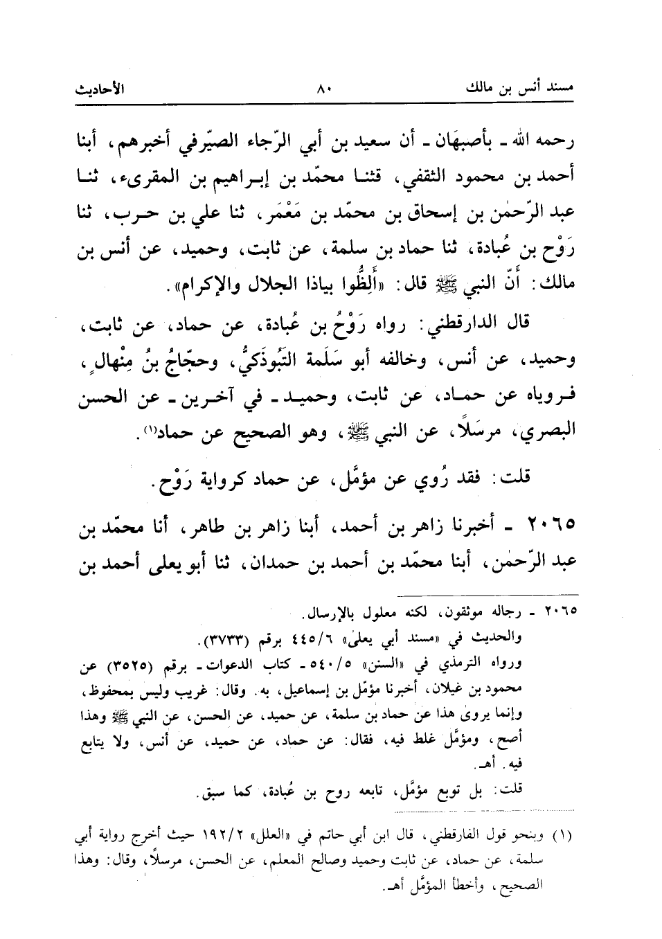 قَالَ الدَّارَقُطْنِيُّ رَوَاهُ رَوْحُ بْنُ عُبَادَةَ عَنْ حَمَّادٍ عَنْ ثَابِتٍ وُحِمَيْدٍ عَنْ أَنَسٍ وَخَالَفَهُ أَبُو سَلَمَةَ التَّبُوذَكِيُّ وَحَجَّاجُ بْنُ مِنْهَالٍ فَرَوَيَاهُ عَنْ حَمَّادٍ عَنْ ثَابِتٍ وَحُمَيْدٍ فِي آخَرِينَ عَنِ الْحَسَنِ الْبَصْرِيِّ مُرْسَلا عَنِ النَّبِيِّ صَلَّى اللَّهُ عَلَيْهِ وَسَلَّمَ وَهُوَ الصَّحِيحُ عَنْ حَمَّادٍ قُلْتُ فَقَدْ رُوِيَ عَنْ مُؤَمَّلٍ عَن حَمَّاد كَرِوَايَة روح رِجَاله موثقون لكنه مَعْلُول بِالْإِرْسَال