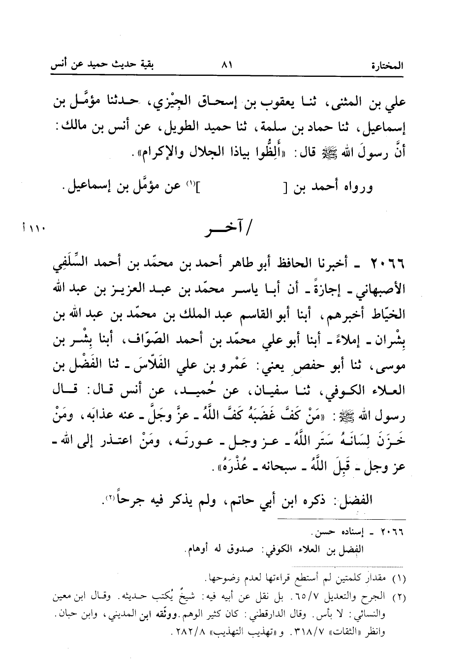 2066 - أَخْبَرَنَا الْحَافِظُ أَبُو طَاهِرٍ أَحْمَدُ بْنُ مُحَمَّدٍ بْنِ أَحْمَدَ السِّلَفِيُّ الأَصْبَهَانِيُّ إِجَازَةً أَنَّ أَبَا يَاسِرٍ مُحَمَّدَ بْنَ عَبْدِ الْعَزِيزِ بْنِ عَبْدِ اللَّهِ الْخَيَّاطَ أَخْبَرَهُمْ أبنا أَبُو الْقَاسِمِ عَبْدُ الْمَلِكِ بْنُ مُحَمَّدِ بْنِ عَبْدِ اللَّهِ بْنِ بِشْرَانَ إِمْلاءً أبنا أَبُو عَلِيٍّ مُحَمَّدُ بْنُ أَحْمَدَ الصَّوَّافُ أبنا بِشْرُ بْنُ مُوسَى ثَنَا أَبُو حَفْصٍ يَعْنِي عَمْرَو بْنَ عَلِيٍّ الْفَلاسَ ثَنَا الْفَضْلُ بْنُ الْعَلاءِ الْكُوفِيُّ ثَنَا سُفْيَانُ عَنْ حُمَيْدٍ عَنْ أَنَسٍ قَالَ قَالَ رَسُولُ اللَّهِ صَلَّى اللَّهُ عَلَيْهِ وَسَلَّمَ مَنْ كَفَّ غَضَبَهُ كَفَّ اللَّهُ عَزَّ وَجَلَّ عَنْهُ عَذَابَهُ وَمَنْ خَزَنَ لِسَانَهُ سَتَرَ اللَّهُ عَزَّ وَجَلَّ عَوْرَتَهُ وَمَنِ اعْتَذَرَ إِلَى اللَّهِ عَزَّ وَجَلَّ قَبِلَ اللَّهُ سُبْحَانَهُ عُذْرَهُ