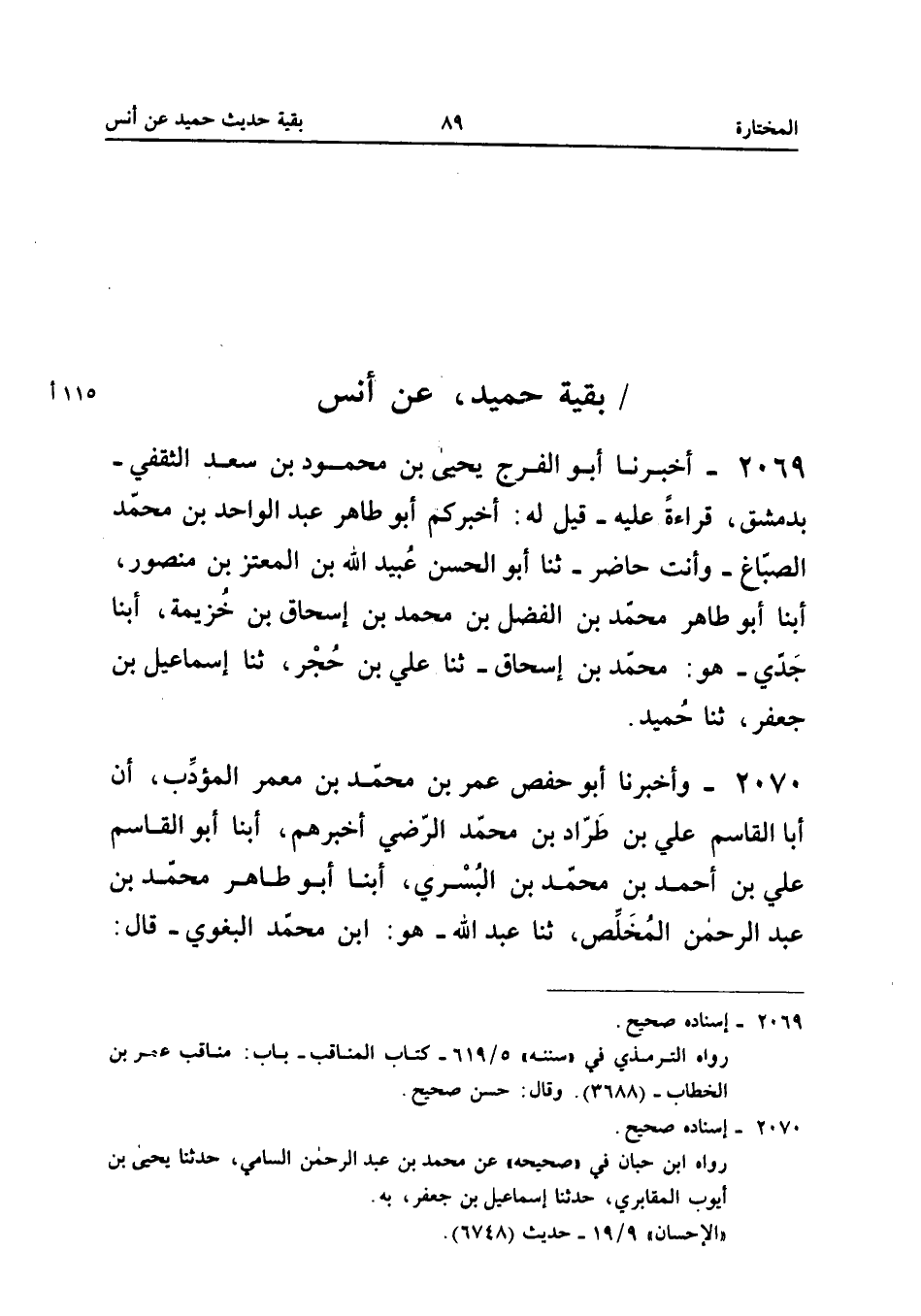 2069 - أَخْبَرَنَا أَبُو الْفَرَجِ يَحْيَى بْنُ مَحْمُودِ بْنِ سَعْدٍ الثَّقَفِيُّ بِدِمَشْقَ قِرَاءَةً عَلَيْهِ قِيلَ لَهُ أَخْبَرَكُمْ أَبُو طَاهِرٍ عَبْدُ الْوَاحِدِ بْنُ مُحَمَّدٍ الصَّبَّاغُ وَأَنْتَ حَاضِرٌ ثَنَا أَبُو الْحَسَنِ عُبَيْدُ اللَّهِ بْنُ الْمُعْتَزِّ بْنِ مَنْصُورٍ أبنا أَبُو طَاهِرٍ مُحَمَّدُ بْنُ الْفَضْلِ بْنِ مُحَمَّدِ بْنِ إِسْحَاقَ بْنِ خُزَيْمَةَ أبنا جَدِّي هُوَ مُحَمَّدُ بْنُ إِسْحَاقَ ثَنَا عَلِيُّ بْنُ حُجْرٍ ثَنَا إِسْمَاعِيل بن جَعْفَر ثَنَا حميد إِسْنَاده صَحِيح