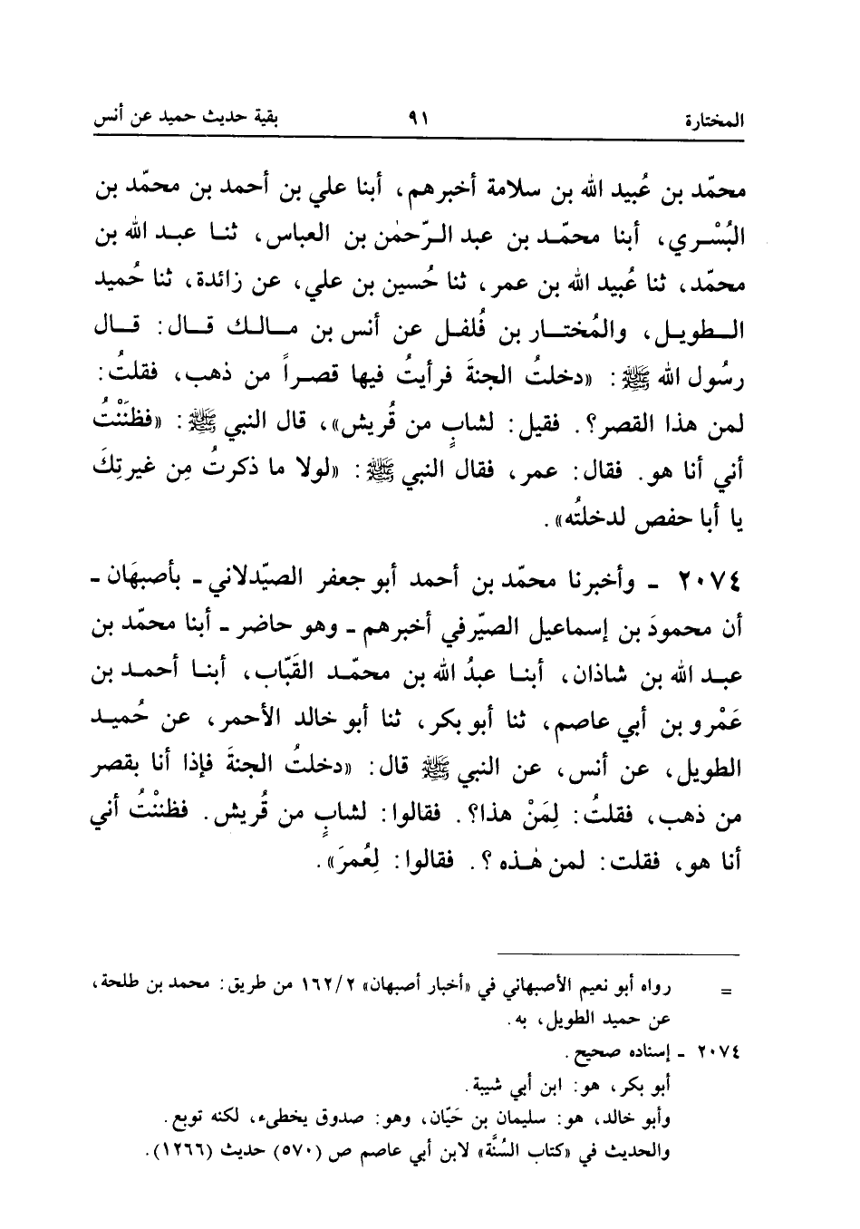 2074 - وَأَخْبَرَنَا مُحَمَّدُ بْنُ أَحْمَدَ أَبُو جَعْفَرٍ الصَّيْدَلانِيُّ بِأَصْبَهَانَ أَنَّ مَحْمُودَ بْنَ إِسْمَاعِيلَ الصَّيْرَفِيَّ أَخْبَرَهُمْ وَهُوَ حَاضِرٌ أبنا مُحَمَّدُ بْنُ عَبْدِ اللَّهِ بْنِ شَاذَانَ أبنا عَبْدُ اللَّهِ بْنُ مُحَمَّدٍ الْقَبَّابُ أبنا أَحْمَدُ بْنُ عَمْرِو بْنِ أَبِي عَاصِمٍ ثَنَا أَبُو بَكْرٍ ثَنَا أَبُو خَالِدٍ الأَحْمَرُ عَنْ حُمَيْدٍ الطَّوِيلِ عَنْ أَنَسٍ عَنِ النَّبِيَّ صَلَّى اللَّهُ عَلَيْهِ وَسَلَّمَ قَالَ دَخَلْتُ الْجَنَّةَ فَإِذَا أَنَا بِقَصْرٍ مِنْ ذَهَبٍ فَقُلْتُ لِمَنْ هَذَا فَقَالُوا لِشَابٍّ مِنْ قُرَيْشٍ فَظَنَنْتُ أَنِّي أَنا هُوَ فَقلت لمن هَذِه فَقَالُوا لعمر