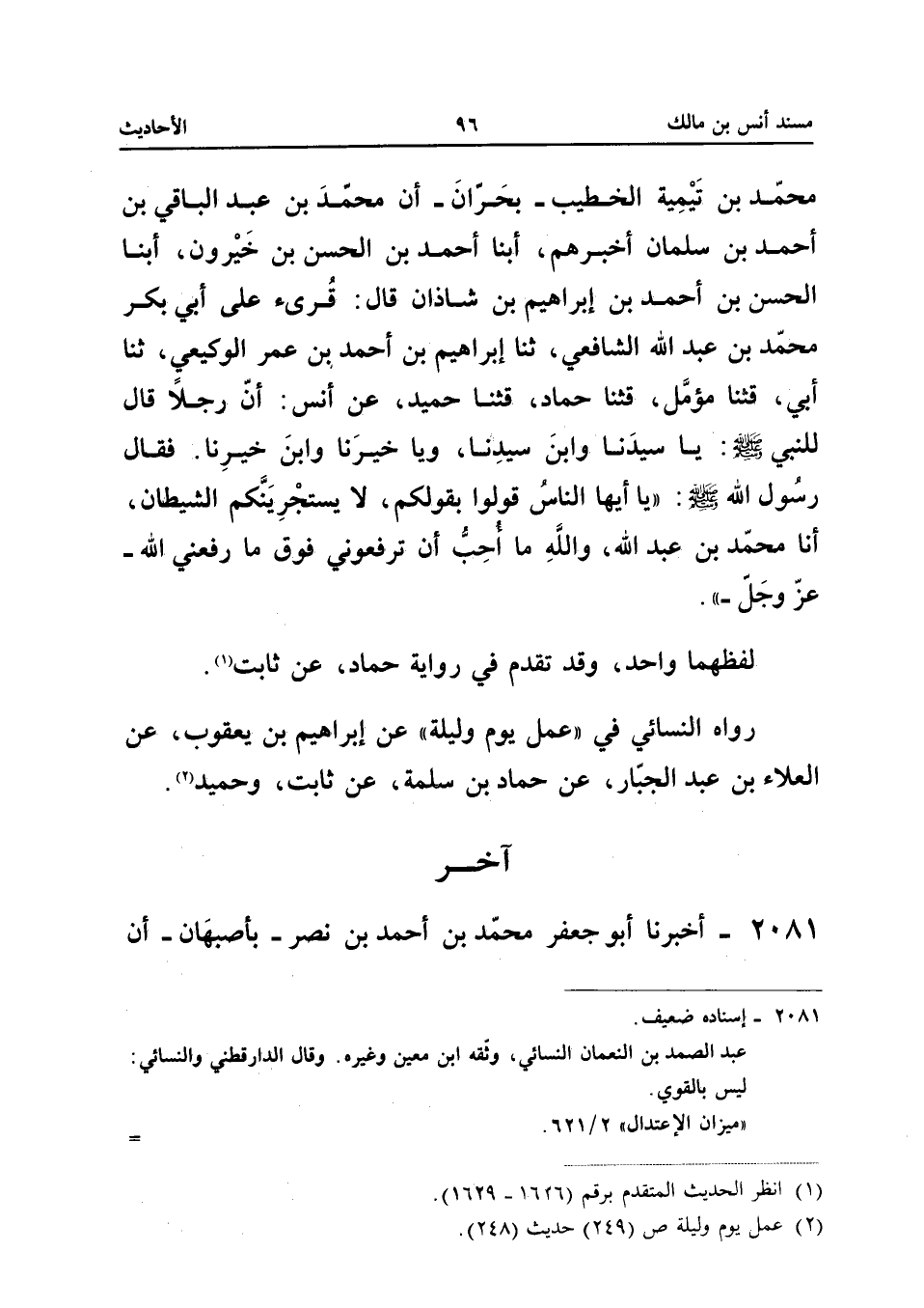 صَلَّى اللَّهُ عَلَيْهِ وَسَلَّمَ يَا سَيِّدَنَا وَابْنَ سَيِّدِنَا وَيَا خَيْرَنَا وَابْنَ خَيْرِنَا فَقَالَ رَسُولُ الله صلى الله عَلَيْهِ وَسلم يَا أَيهَا النَّاسُ قُولُوا بِقَوْلِكُمْ لَا يَسْتَجْرِيَنَّكُمُ الشَّيْطَانُ أَنَا مُحَمَّدُ بْنُ عَبْدِ اللَّهِ وَاللَّهِ مَا أُحِبُّ أَنْ تَرْفَعُونِي فَوْقَ مَا رَفَعَنِي اللَّهُ عَزَّ وَجَلَّ