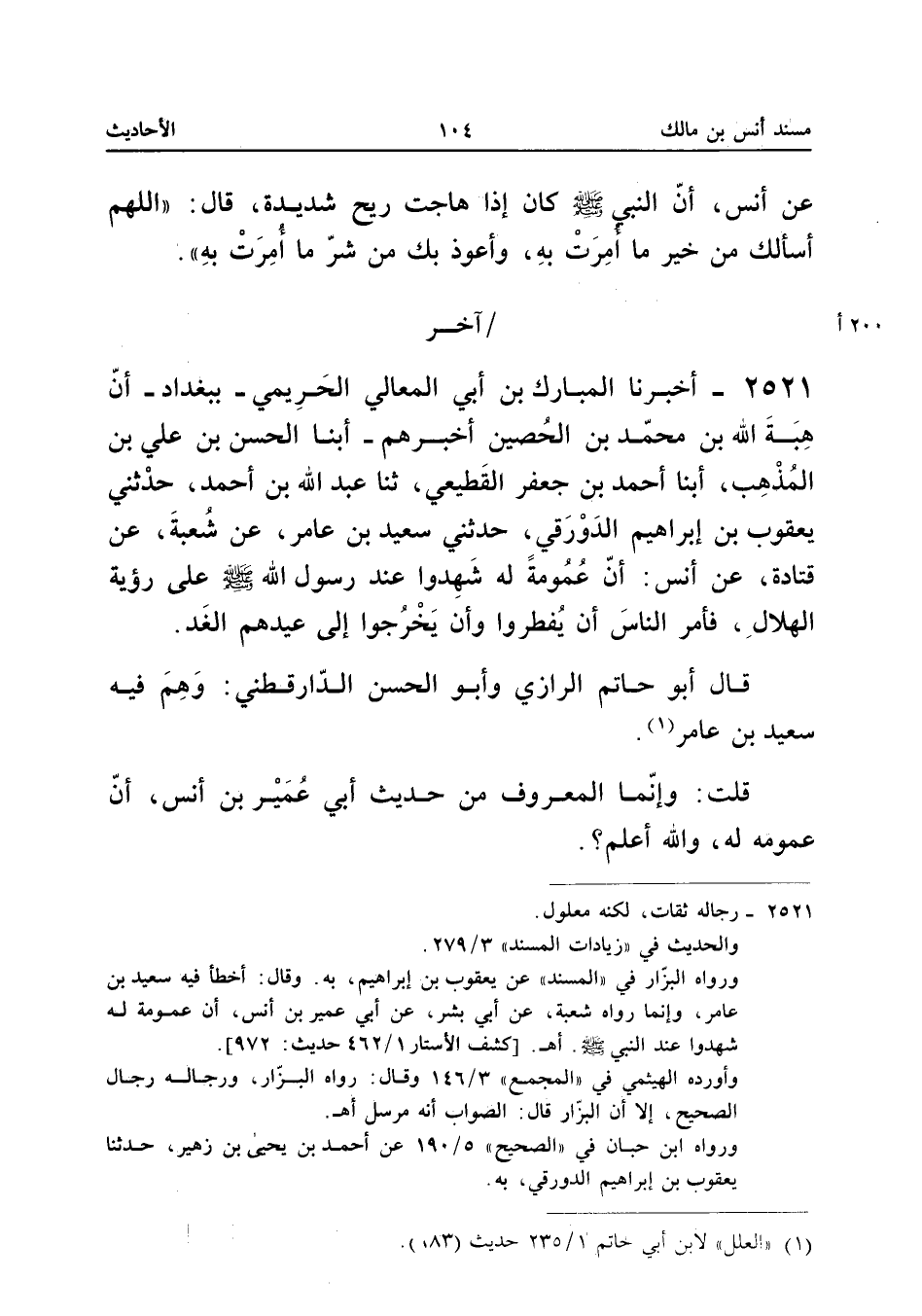 2521 - أَخْبَرَنَا الْمُبَارَكُ بْنُ أَبِي الْمَعَالِي الْحَرِيمِيُّ بِبَغْدَادَ أَنَّ هِبَةَ اللَّهِ بْنَ مُحَمَّدِ بْنِ الْحُصَيْنِ أَخْبَرَهُمْ أبنا الْحَسَنُ بْنُ عَلِيِّ بْنِ الْمُذْهِبِ أبنا أَحْمَدُ بْنُ جَعْفَرٍ الْقَطِيعِيُّ ثَنَا عَبْدُ اللَّهِ بْنُ أَحْمَدَ حَدَّثَنِي يَعْقُوبُ بْنُ إِبْرَاهِيمَ الدَّوْرَقِيُّ حَدَّثَنِي سَعِيدُ بْنُ عَامِرٍ عَنْ شُعْبَةَ عَنْ قَتَادَةَ عَنْ أَنَسٍ أَنَّ عُمُومَةً لَهُ شَهِدُوا عِنْدَ رَسُولِ اللَّهِ صَلَّى اللَّهُ عَلَيْهِ وَسَلَّمَ عَلَى رُؤْيَةِ الْهِلالِ فَأَمَرَ النَّاسَ أَنْ يُفْطِرُوا وَأَنْ يَخْرُجُوا إِلَى عِيدِهِمُ الْغَدَ