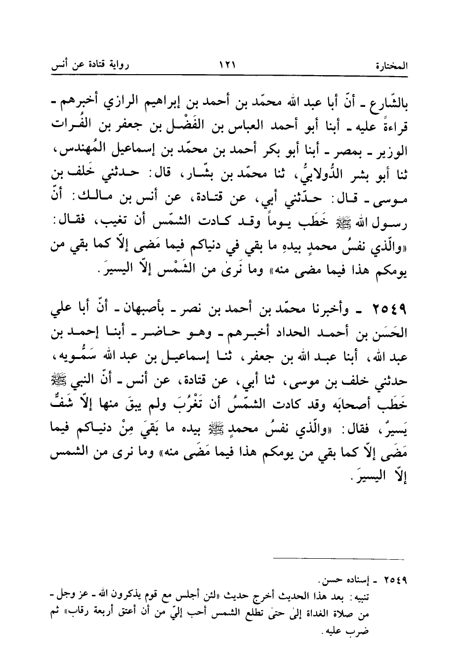 2549 - وَأَخْبَرَنَا مُحَمَّدُ بْنُ أَحْمَدَ بْنِ نَصْرٍ بِأَصْبَهَانَ أَنَّ أَبَا عَلِيٍّ الْحَسَنَ بْنَ أَحْمَدَ الْحَدَّادَ أَخْبَرَهُمْ وَهُوَ حَاضِرٌ أبنا أَحْمَدُ بْنُ عَبْدِ اللَّهِ أبنا عَبْدُ اللَّهِ بْنُ جَعْفَرٍ ثَنَا إِسْمَاعِيلُ بْنُ عَبْدِ اللَّهِ سَمُّوَيْهِ حَدَّثَنِي خَلَفُ بْنُ مُوسَى ثَنَا أَبِي عَنْ قَتَادَةَ عَنْ أَنَسٍ أَنَّ النَّبِيَّ صَلَّى اللَّهُ عَلَيْهِ وَسَلَّمَ خَطَبَ أَصْحَابَهُ وَقَدْ كَادَتِ الشَّمْسُ أَنْ تَغْرُبَ وَلَمْ يَبْقَ مِنْهَا إِلا شَفٌّ يَسِيرٌ فَقَالَ وَالَّذِي نَفْسُ مُحَمَّدٍ صَلَّى اللَّه عَلَيْهِ وَسَلَّمَ بِيَدِهِ مَا بَقِيَ مِنْ دُنْيَاكُمْ فِيمَا مَضَى إِلا كَمَا بَقِيَ مِنْ يَوْمِكُمْ هَذَا فِيمَا مَضَى مِنْهُ وَمَا نَرَى مِنَ الشَّمْسِ إِلا الْيَسِير