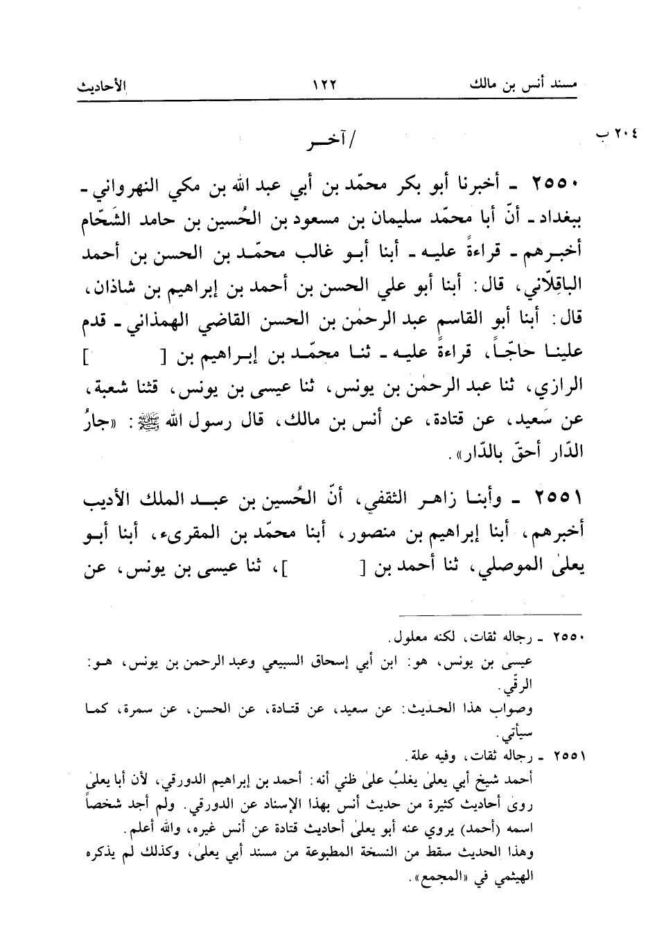 2550 - أَخْبَرَنَا أَبُو بَكْرٍ مُحَمَّدُ بْنُ أَبِي عَبْدِ اللَّهِ بْنِ مَكِّيٍّ النَّهْرَوَانِيُّ بِبَغْدَادَ أَنَّ أَبَا مُحَمَّدٍ سُلَيْمَانَ بْنَ مَسْعُودِ بْنِ الْحُسَيْنِ بْنِ حَامِدٍ الشَّحَّامَ أَخْبَرَهُمْ قِرَاءَةً عَلَيْهِ أبنا أَبُو غَالِبٍ مُحَمَّدُ بْنُ الْحَسَنِ بْنِ أَحْمَدَ الْبَاقِلانِيُّ قَالَ أبنا أَبُو عَلِيٍّ الْحَسَنُ بْنُ أَحْمَدَ بْنِ إِبْرَاهِيمَ بْنِ شَاذَانَ قَالَ أبنا أَبُو الْقَاسِمِ عَبْدُ الرَّحْمَنِ بْنُ الْحَسَنِ الْقَاضِي الْهَمَذَانِيُّ قَدِمَ عَلَيْنَا حَاجًّا قِرَاءَةً عَلَيْهِ ثَنَا مُحَمَّدُ بْنُ إِبْرَاهِيمَ بْنِ [] الرَّازِيُّ ثَنَا عَبْدُ الرَّحْمَنِ بْنُ يُونُسَ ثَنَا عِيسَى بْنُ يُونُسَ قثنا شُعْبَةُ عَنْ سَعِيدٍ عَنْ قَتَادَةَ عَنْ أَنَسِ بْنُ مَالِكٍ قَالَ رَسُولُ اللَّهِ صَلَّى اللَّهُ عَلَيْهِ وَسلم جَار الدَّار أَحَق بِالدَّار رِجَاله ثِقَات وَفِيه عِلّة