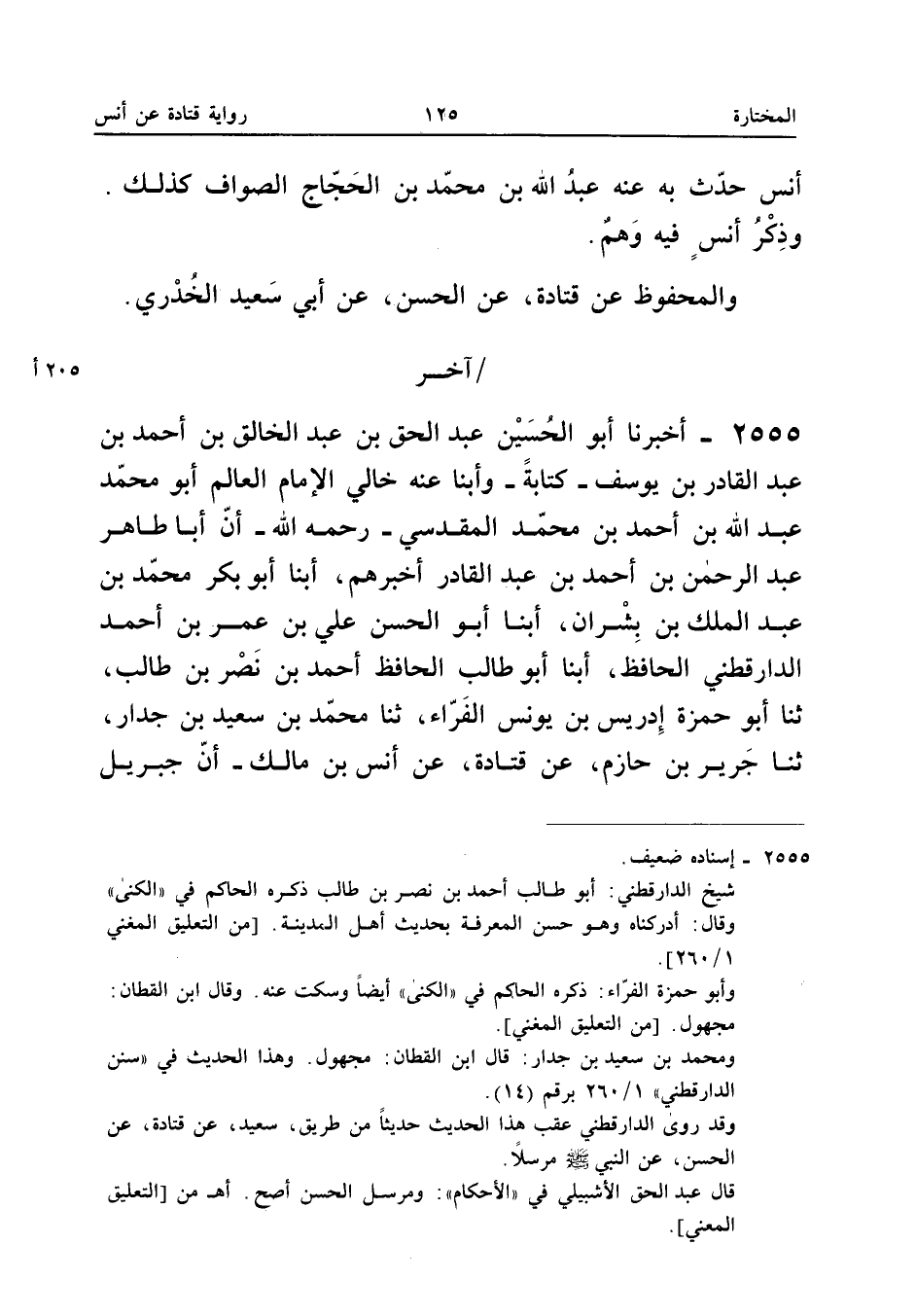 2555 - أَخْبَرَنَا أَبُو الْحُسَيْنِ عَبْدُ الْحَقِّ بْنُ عَبْدِ الْخَالِقِ بْنِ أَحْمَدَ بْنِ عَبْدِ الْقَادِرِ بْنِ يُوسُفَ كِتَابَةً وَأبنا عَنْهُ خَالِي الإِمَامُ الْعَالِمُ أَبُو مُحَمَّدٍ عَبْدُ اللَّهِ بْنُ أَحْمَدَ بْنِ مُحَمَّدٍ الْمَقْدِسِيُّ رَحِمَهُ اللَّهُ أَنَّ أَبَا طَاهِرٍ عَبْدُ الرَّحْمَنِ بْنُ أَحْمَدَ بْنِ عَبْدِ الْقَادِرِ أَخْبَرَهُمْ أبنا أَبُو بَكْرٍ مُحَمَّدُ بْنُ عَبْدِ الْمَلِكِ بْنِ بِشْرَانَ أبنا أَبُو الْحَسَنِ عَلِيُّ بْنُ عُمَرَ بْنِ أَحْمَدَ الدَّارَقُطْنِيُّ الْحَافِظُ أبنا أَبُو طَالِبٍ الْحَافِظُ أَحْمَدُ بْنُ نَصْرِ بْنِ طَالِبٍ ثَنَا أَبُو حَمْزَةَ إِدْرِيسُ بْنُ يُونُسَ الْفَرَّاءُ ثَنَا مُحَمَّدُ بْنُ سَعِيدِ بْنِ جَدَّارٍ ثَنَا جَرِيرُ بْنُ حَازِمٍ عَنْ قَتَادَةَ عَنْ أَنَسِ بْنِ مَالِكٍ أَنَّ جِبْرِيلَ عَلَيْهِ السَّلامُ أَتَى النَّبِي