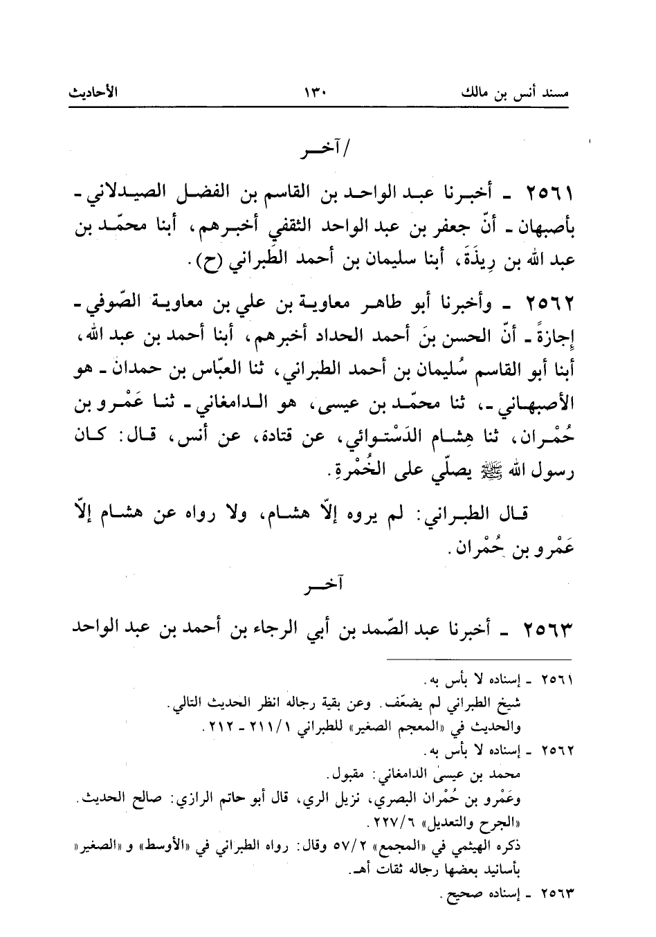 2562 - وَأَخْبَرَنَا أَبُو طَاهِرٍ مُعَاوِيَةُ بْنُ عَلِيِّ بْنِ مُعَاوِيَةَ الصُّوفِيُّ إِجَازَةً أَنَّ الْحَسَنَ بْنَ أَحْمَدَ الْحَدَّادَ أَخْبَرَهُمْ أبنا أَحْمَدُ بْنُ عَبْدِ اللَّهِ أبنا أَبُو الْقَاسِمِ سُلَيْمَانُ بْنُ أَحْمَدَ الطَّبَرَانِيُّ ثَنَا الْعَبَّاسُ بْنُ حَمْدَانَ هُوَ الأَصْبَهَانِيُّ ثَنَا مُحَمَّدُ بْنُ عِيسَى هُوَ الدَّامَغَانِيُّ ثَنَا عَمْرُو بْنُ حُمْرَانَ ثَنَا هِشَامٌ الدَّسْتُوَائِيُّ عَنْ قَتَادَةَ عَنْ أَنَسٍ قَالَ كَانَ رَسُولُ اللَّهِ صَلَّى اللَّهُ عَلَيْهِ وَسَلَّمَ يُصَلِّي عَلَى الْخُمْرَةِ