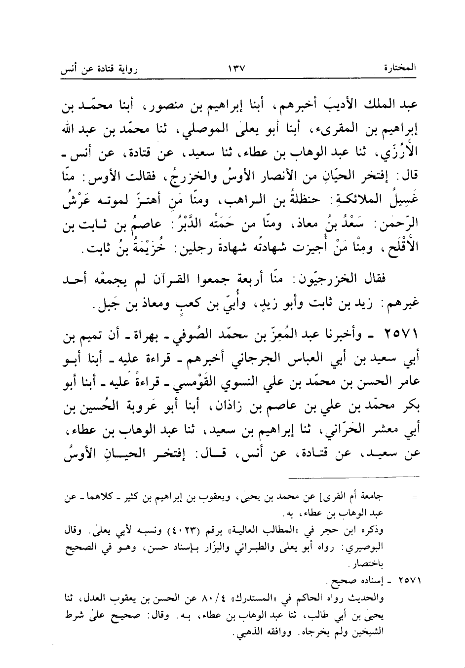 2571 - وَأَخْبَرَنَا عَبْدُ الْمُعِزِّ بْنُ مُحَمَّدٍ الصُّوفِيُّ بِهَرَاةَ أَنَّ تَمِيمَ بْنَ أَبِي سَعِيدِ بْنِ أَبِي الْعَبَّاسِ الْجُرْجَانِيُّ أَخْبَرَهُمْ قِرَاءَةً عَلَيْهِ أبنا أَبُو عَامِرٍ الْحَسَنُ بْنُ مُحَمَّدِ بْنِ عَلِيٍّ النَّسَوِيُّ الْقُومسِيُّ قِرَاءَةً عَلَيْهِ أبنا أَبُو بَكْرٍ مُحَمَّدُ بْنُ عَلِيِّ بْنِ عَاصِمِ بْنِ زَاذَانَ أبنا أَبُو عَرُوبَةَ الْحُسَيْنُ بْنُ أَبِي مَعْشَرٍ الْحَرَّانِيُّ ثَنَا إِبْرَاهِيمُ بْنُ سَعِيدٍ ثَنَا عَبْدُ الْوَهَّابِ بْنُ عَطَاءٍ عَنْ سَعِيدٍ عَنْ قَتَادَةَ عَنْ أَنَسٍ قَالَ افْتَخَرَ الْحَيَّانِ الأَوْسُ