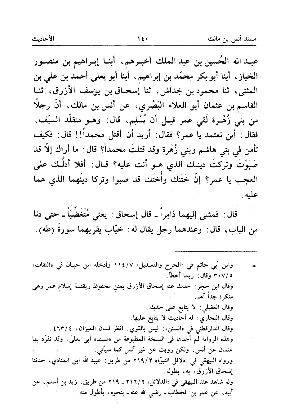 عَبْدِ اللَّهِ الْحُسَيْنَ بْنَ عَبْدِ الْمَلِكِ أَخْبَرَهُمْ أبنا إِبْرَاهِيمُ بْنُ مَنْصُورٍ الْخَبَّازُ أبنا أَبُو بَكْرٍ مُحَمَّدُ بْنُ إِبْرَاهِيمَ أبنا أَبُو يَعْلَى أَحْمَدُ بْنُ عَلِيِّ بْنِ الْمُثَنَّى ثَنَا مَحْمُودُ بْنُ خِدَاشٍ ثَنَا إِسْحَاقُ بْنُ يُوسُفَ الأَزْرَقُ ثَنَا الْقَاسِمُ بْنُ عُثْمَانَ أَبُو الْعَلاءِ الْبَصْرِيُّ عَنْ أَنَسِ بْنِ مَالِكٍ أَنَّ رَجُلا مِنَ بَنِي زُهْرَةَ لَقِيَ عُمَرَ قَبْلَ أَنْ يُسْلِمَ قَالَ وَهُوَ مُتَقَلِّدُ السَّيْفَ فَقَالَ أَيْنَ تَعْتَمِدُ يَا عُمَرُ فَقَالَ أُرِيدُ أَنْ أَقْتُلَ مُحَمَّدًا قَالَ فَكَيْفَ تَأْمَنُ فِي بَنِي هَاشِمٍ وَبَنِي زُهْرَةَ وَقَدْ قَتَلْتَ مُحَمَّدًا قَالَ مَا أَرَاكَ إِلا قَدْ صَبَوْتَ وَتَرَكْتَ دِينَكَ الَّذِي هُوَ أَنْتَ عَلَيْهِ قَالَ أَفَلا أَدُلُّكَ عَلَى الْعَجَبِ يَا عُمَرُ إِنَّ خَتَنَكَ وَأُخْتَكَ قَدْ صَبَوَا وَتَرَكَا دِينَهُمَا الَّذِي هُمَا عَلَيْهِ قَالَ فَمَشَى إِلَيْهِمَا ذَامِرًا قَالَ إِسْحَاقُ يَعْنِي مُتَغَضِّبًا حَتَّى دَنَا مِنَ الْبَابِ قَالَ وَعِنْدَهُمَا رَجُلٌ يُقَالُ لَهُ خَبَّابٌ يُقْرِيهِمَا سُورَةَ (طه)