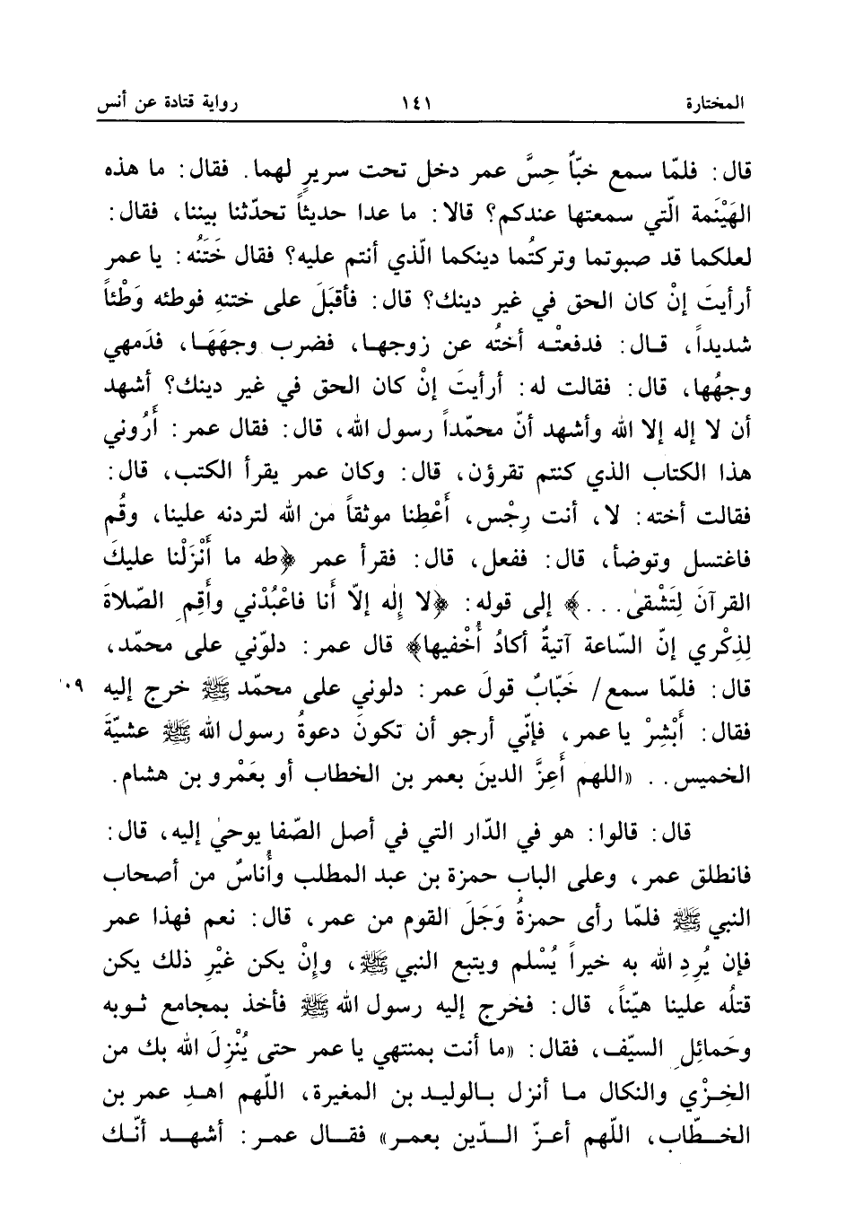 قَالَ فَلَمَّا سمع خبا حِسَّ عُمَرَ دَخَلَ تَحْتَ سَرِيرٍ لَهُمَا فَقَالَ مَا هَذِهِ الْهَيْنَمَةُ الَّتِي سَمِعْتُهَا عِنْدَكُمْ قَالا مَا عَدَا حَدِيثًا تَحَدَّثنا بَيْنَنَا فَقَالَ لَعَلَّكُمَا قَدْ صَبَوْتُمَا وَتَرَكْتُمَا دِينَكُمَا الَّذِي أَنْتُمْ عَلَيْهِ فَقَالَ خَتَنُهُ يَا عُمَرُ أَرَأَيْتَ إِنْ كَانَ الْحَقُّ فِي غَيْرِ دِينِكَ قَالَ فَأَقْبَلَ عَلَى خَتْنِهِ فَوَطِئَهُ وَطْئًا شَدِيدًا قَالَ فَدَفَعَتْهُ أُخْتُهُ عَن زَوجهَا فَضرب وَجههَا فدمهي وَجْهُهَا قَالَ فَقَالَتْ لَهُ أَرَأَيْتَ إِنْ كَانَ الْحَقُّ فِي غَيْرِ دِينِكَ أَشْهَدُ أَنْ لَا إِلَهَ إِلا اللَّهُ وَأَشْهَدُ أَنَّ مُحَمَّدًا رَسُولُ اللَّهِ قَالَ فَقَالَ عُمَرُ أَرُونِي هَذَا الْكِتَابَ الَّذِي كُنْتُم تقرؤون قَالَ وَكَانَ عُمَرُ يَقْرَأُ الْكُتُبَ قَالَ فَقَالَتْ أُخْتُهُ لَا أَنْتَ رَجِسٌ أَعْطِنَا مَوْثِقًا مِنَ اللَّهِ لَتَرُدَّنَّهُ عَلَيْنَا وَقُمْ فَاغْتَسِلْ وَتَوَضَّأْ قَالَ فَفَعَلَ قَالَ فَقَرَأَ عُمَرُ {طه مَا أَنْزَلْنَا عَلَيْك الْقُرْآن لتشقى} إِلَى قَوْلِهِ {لَا إِلَهَ إِلا أَنَا فَاعْبُدْنِي وَأَقِمِ الصَّلاةَ لِذِكْرِي إِنَّ السَّاعَةَ آتِيَةٌ أَكَادُ أخفيها} قَالَ عُمَرُ دُلُّونِي عَلَى مُحَمَّدٍ قَالَ فَلَمَّا سَمِعَ خَبَّابٌ قَوْلَ عُمَرَ دُلُّونِي عَلَى مُحَمَّدٍ صَلَّى اللَّهُ عَلَيْهِ وَسَلَّمَ خَرَجَ إِلَيْهِ فَقَالَ أَبْشِرْ يَا عُمَرُ فَإِنِّي أَرْجُو أَنْ تَكُونَ دَعْوَةُ رَسُولِ اللَّهِ صَلَّى اللَّهُ عَلَيْهِ وَسَلَّمَ عَشِيَّة الْخَمِيس الله أَعِزَّ الدِّينَ بِعُمَرَ بْنِ الْخَطَّابِ أَوْ بِعَمْرِو بْنِ هِشَامٍ قَالَ قَالُوا هُوَ فِي الدَّارِ الَّتِي فِي أَصْلِ الصَّفَا يُوحَى إِلَيْهِ قَالَ فَانْطَلَقَ عُمَرُ وَعَلَى الْبَابِ حَمْزَةُ بْنُ عَبْدِ الْمُطَّلِبِ وَأُنَاسٌ مِنْ أَصْحَابِ النَّبِيِّ صَلَّى اللَّهُ عَلَيْهِ وَسَلَّمَ فَلَمَّا رَأَى حَمْزَةُ وَجِلَ الْقَوْمُ مِنْ عُمَرَ قَالَ نَعَمْ فَهَذَا عُمَرُ فَإِنْ يُرِدِ اللَّهُ بِهِ خَيْرًا يُسْلِمْ وَيَتَّبِعِ النَّبِيَّ صَلَّى اللَّهُ عَلَيْهِ وَسَلَّمَ وَإِنْ يَكُنْ غَيْرَ ذَلِكَ يَكُنْ قَتْلُهُ عَلَيْنَا هَيِّنًا قَالَ فَخَرَجَ إِلَيْهِ رَسُولُ اللَّهِ صَلَّى اللَّه عَلَيْهِ وَسَلَّمَ فَأخذ يمجامع ثَوْبه وحمائل السَّيْف فَقَالَ مَا أَنْت بمنتهي يَا عُمَرُ حَتَّى يُنْزِلَ اللَّهُ بِكَ مِنَ الْخِزْيِ وَالنَّكَالِ مَا أَنْزَلَ بِالْوَلِيدِ بْنِ الْمُغِيرَةِ اللَّهُمَّ اهْدِ عُمَرَ بْنَ الْخَطَّابِ اللَّهُمَّ أَعِزَّ الدِّينَ بِعُمَرَ فَقَالَ عُمَرُ أَشْهَدُ أَنَّكَ