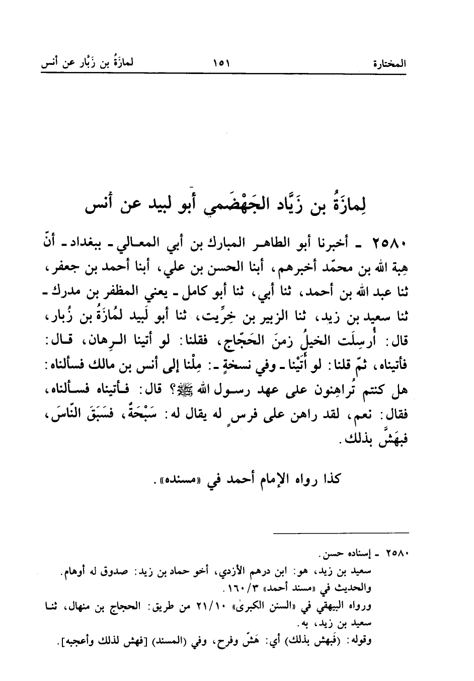 2580 - أَخْبَرَنَا أَبُو الطَّاهِرِ الْمُبَارَكُ بْنُ أَبِي الْمَعَالِي بِبَغْدَادَ أَنَّ هِبَةَ اللَّهِ بْنَ مُحَمَّدٍ أَخْبَرَهُمْ أبنا الْحَسَنُ بْنُ عَلِيٍّ أبنا أَحْمَدُ بْنُ جَعْفَرٍ ثَنَا عَبْدُ اللَّهِ بْنُ أَحْمَدَ ثَنَا أَبِي ثَنَا أَبُو كَامِلٍ يَعْنِي الْمُظَفَّرَ بْنَ مُدْرَكٍ ثَنَا سَعِيدُ بْنُ زَيْدٍ ثَنَا الزُّبَيْرُ بْنُ خِرِّيتٍ ثَنَا أَبُو لَبِيدٍ لِمَازَةُ بْنُ زَبَّارٍ قَالَ أُرْسِلَتِ الْخَيْلُ زَمَنَ الْحَجَّاجِ فَقُلْنَا لَوْ أُتِينَا الرِّهَانُ قَالَ فَأُتِينَاهُ ثُمَّ قُلْنَا لَوْ أُتِينَا وَفِي نُسْخَةٍ مِلْنَا إِلَى أَنَسِ بْنِ مَالِكٍ فَسَأَلْنَاهُ هَلْ كُنْتُمْ تُرَاهِنُونَ عَلَى عَهْدِ رَسُولِ اللَّهِ صَلَّى اللَّهُ عَلَيْهِ وَسَلَّمَ قَالَ فَأَتَيْنَاهُ فَسَأَلْنَاهُ فَقَالَ نَعَمْ لَقَدْ رَاهَنَ عَلَى فَرَسٍ لَهُ يُقَالُ لَهُ سُبْحَةُ فَسَبَقَ النَّاسَ فَبُهِشَ بِذَلِكَ