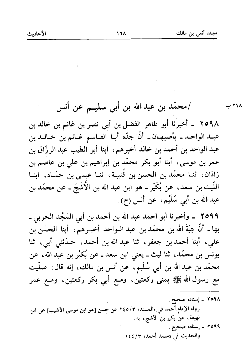 2598 - أَخْبَرَنَا أَبُو طَاهِرٍ الْفَضْلُ بْنُ أَبِي نَصْرِ بْنِ غَانِمِ بْنِ خَالِدِ بْنِ عَبْدِ الْوَاحِدِ بِأَصْبَهَانَ أَنَّ جَدَّهُ أَبَا الْقَاسِمِ غَانِمَ بْنَ خَالِدِ بْنِ عَبْدِ الْوَاحِدِ بْنِ أَحْمَدَ بْنِ خَالِدٍ أَخْبَرَهُمْ أبنا أَبُو الطَّيِّبِ عَبْدُ الرَّزَّاقِ بْنُ عُمَرَ بْنِ مُوسَى أبنا أَبُو بَكْرٍ مُحَمَّدُ بْنُ إِبْرَاهِيمَ بْنِ عَلِيِّ بْنِ عَاصِمٍ بْنِ زَاذَانَ ثَنَا مُحَمَّدُ بْنُ الْحَسَنِ بْنِ قُتَيْبَةَ ثَنَا عِيسَى بْنُ حَمَّادٍ أبنا اللَّيْثُ بْنُ سَعْدٍ عَنْ بُكَيْرٍ هُوَ ابْنُ عَبْدِ اللَّهِ بْنِ الأَشَجِّ عَنْ مُحَمَّدِ بْنِ عَبْدِ اللَّهِ بْنِ أَبِي سُلَيْمٍ عَنْ أَنَسٍ (ح) إِسْنَاده صَحِيح
