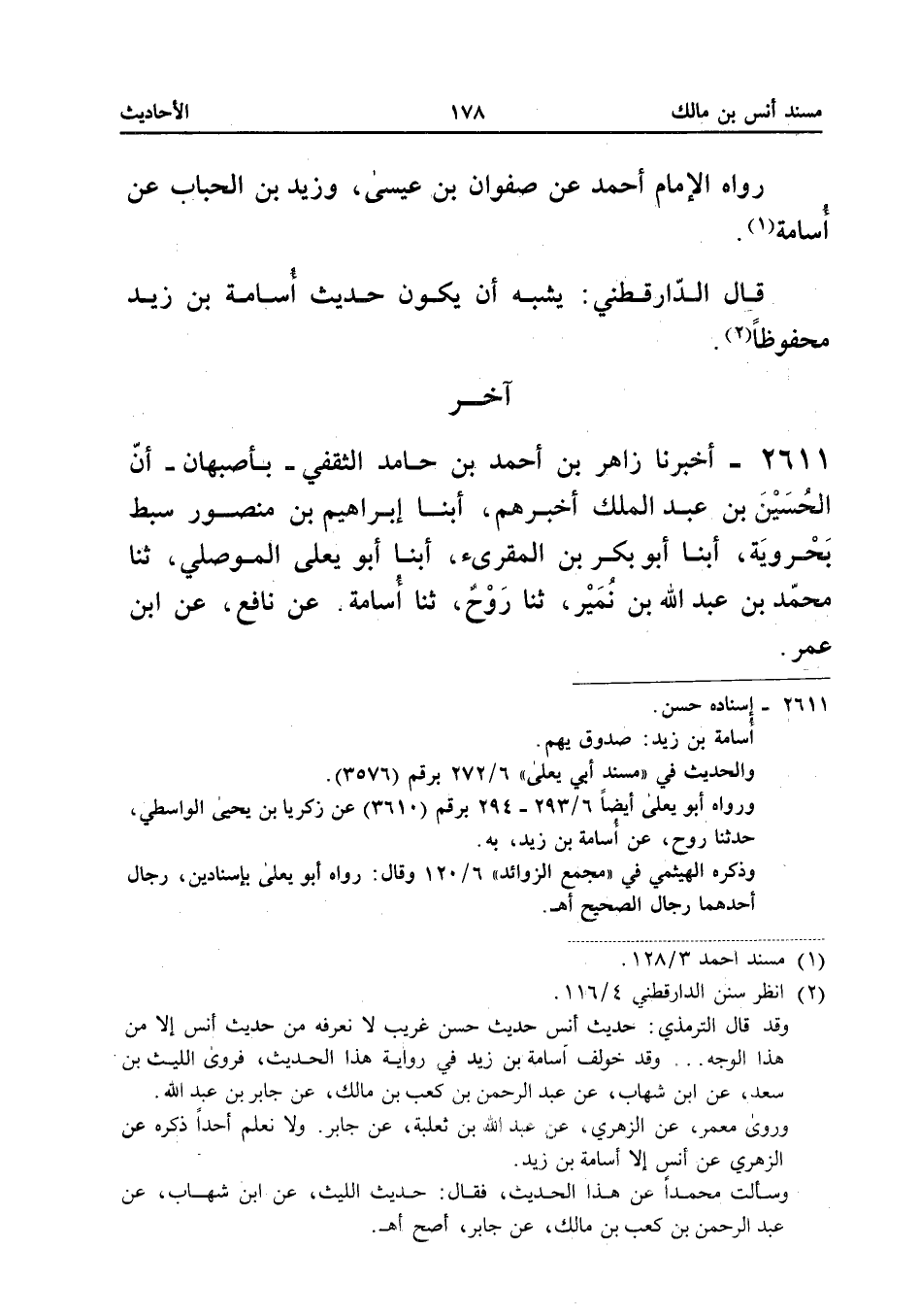 رَوَاهُ الإِمَامُ أَحْمَدُ عَنْ صَفْوَانَ بْنِ عِيسَى وَزَيْدِ بْنِ الْحُبَابِ عَنْ أُسَامَةَ قَالَ الدَّارَقُطْنِيُّ يُشْبِهُ أَنْ يَكُونَ حَدِيث أُسَامَة بن زيد مَحْفُوظًا