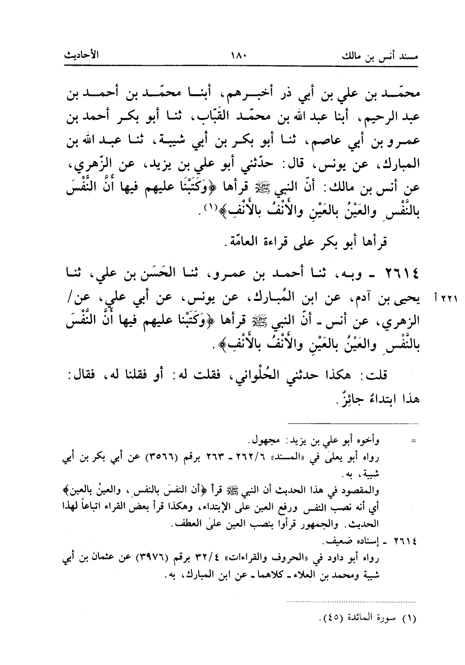 2614 - وَبِهِ ثَنَا أَحْمَدُ بْنُ عَمْرٍو ثَنَا الْحَسَنُ بْنُ عَلِيٍّ ثَنَا يَحْيَى بْنُ آدَمَ عَنِ ابْنِ الْمُبَارَكِ عَنْ يُونُسَ عَنْ أَبِي عَلِيٍّ عَنِ الزُّهْرِيِّ عَنْ أَنَسٍ أَنَّ النَّبِيَّ صَلَّى اللَّهُ عَلَيْهِ وَسَلَّمَ قَرَأَهَا {وَكَتَبْنَا عَلَيْهِمْ فِيهَا أَنَّ النَّفْسَ بِالنَّفْسِ وَالْعَيْنَ بِالْعَيْنِ وَالأَنْفَ بِالأَنْفِ}
