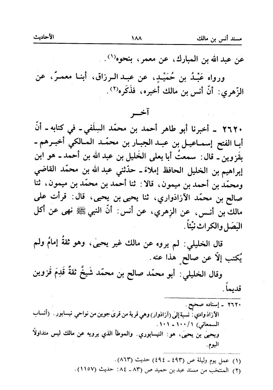 2620 - أَخْبَرَنَا أَبُو طَاهِرٍ أَحْمَدُ بْنُ مُحَمَّدٍ السِّلَفِيُّ فِي كِتَابِهِ أَنَّ أَبَا الْفَتْحِ إِسْمَاعِيلَ بْنَ عَبْدِ الْجَبَّارِ بْنِ مُحَمَّدٍ الْمَالِكِيَّ أَخْبَرَهُمْ بِقَزْوِينَ قَالَ سَمِعْتُ أَبَا يَعْلَى الْخَلِيلَ بْنَ عَبْدِ اللَّهِ بْنِ أَحْمَدَ هُوَ ابْنُ إِبْرَاهِيمَ بْنِ الْخَلِيلِ الْحَافِظَ إِمْلاءً حَدَّثَنِي عَبْدُ اللَّهِ بْنُ مُحَمَّدٍ الْقَاضِي وَمُحَمَّدُ بْنُ أَحْمَدَ بْنِ مَيْمُونٍ قَالا ثَنَا أَحْمَدُ بْنُ مُحَمَّدِ بْنِ مَيْمُونٍ ثَنَا صَالِحُ بْنُ مُحَمَّدٍ الآزَاذْوَارِيُّ ثَنَا يَحْيَى بْنُ يَحْيَى قَالَ قَرَأْتُ عَلَى مَالِكِ بْنِ أَنَسٍ عَنِ الزُّهْرِيِّ عَنْ أَنَسٍ أَنَّ النَّبِيَّ صَلَّى اللَّهُ عَلَيْهِ وَسَلَّمَ نَهَى عَنْ أَكْلِ الْبَصَلِ وَالْكُرَّاثِ نَيِّئًا
