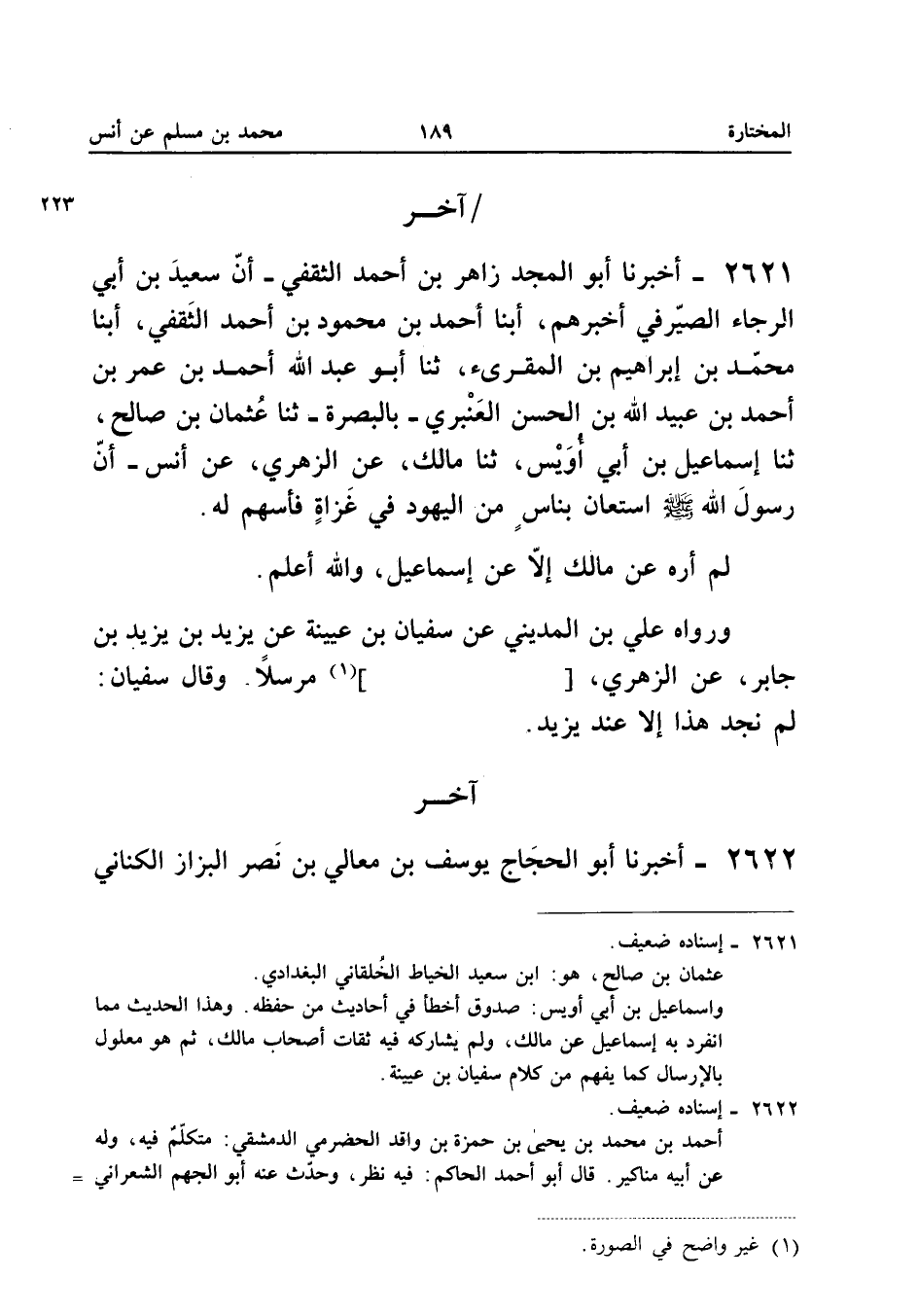 2621 - أَخْبَرَنَا أَبُو الْمَجْدِ زَاهِرُ بْنُ أَحْمَدَ الثَّقَفِيُّ أَنَّ سَعِيدَ بْنَ أَبِي الرَّجَاءِ الصَّيْرَفِيَّ أَخْبَرَهُمْ أبنا أَحْمَدُ بْنُ مَحْمُودِ بْنِ أَحْمَدَ الثَّقَفِيُّ أبنا مُحَمَّد بن إِبْرَاهِيم بن الْمُقْرِئِ ثَنَا أَبُو عَبْدِ اللَّهِ أَحْمَدُ بْنُ عُمَرَ بْنِ أَحْمَدَ بْنِ عُبَيْدِ اللَّهِ بْنِ الْحَسَنِ الْعَنْبَرِيُّ بِالْبَصْرَةِ ثَنَا عُثْمَانُ بْنُ صَالِحٍ ثَنَا إِسْمَاعِيلُ بْنُ أَبِي أُوَيْسٍ ثَنَا مَالِكٌ عَنِ الزُّهْرِيِّ عَنْ أَنَسٍ أَنَّ رَسُولَ اللَّهِ صَلَّى اللَّهُ عَلَيْهِ وَسَلَّمَ اسْتَعَانَ بِنَاسٍ مِنَ الْيَهُودِ فِي غَزَاةٍ فَأَسْهَمَ لَهُ