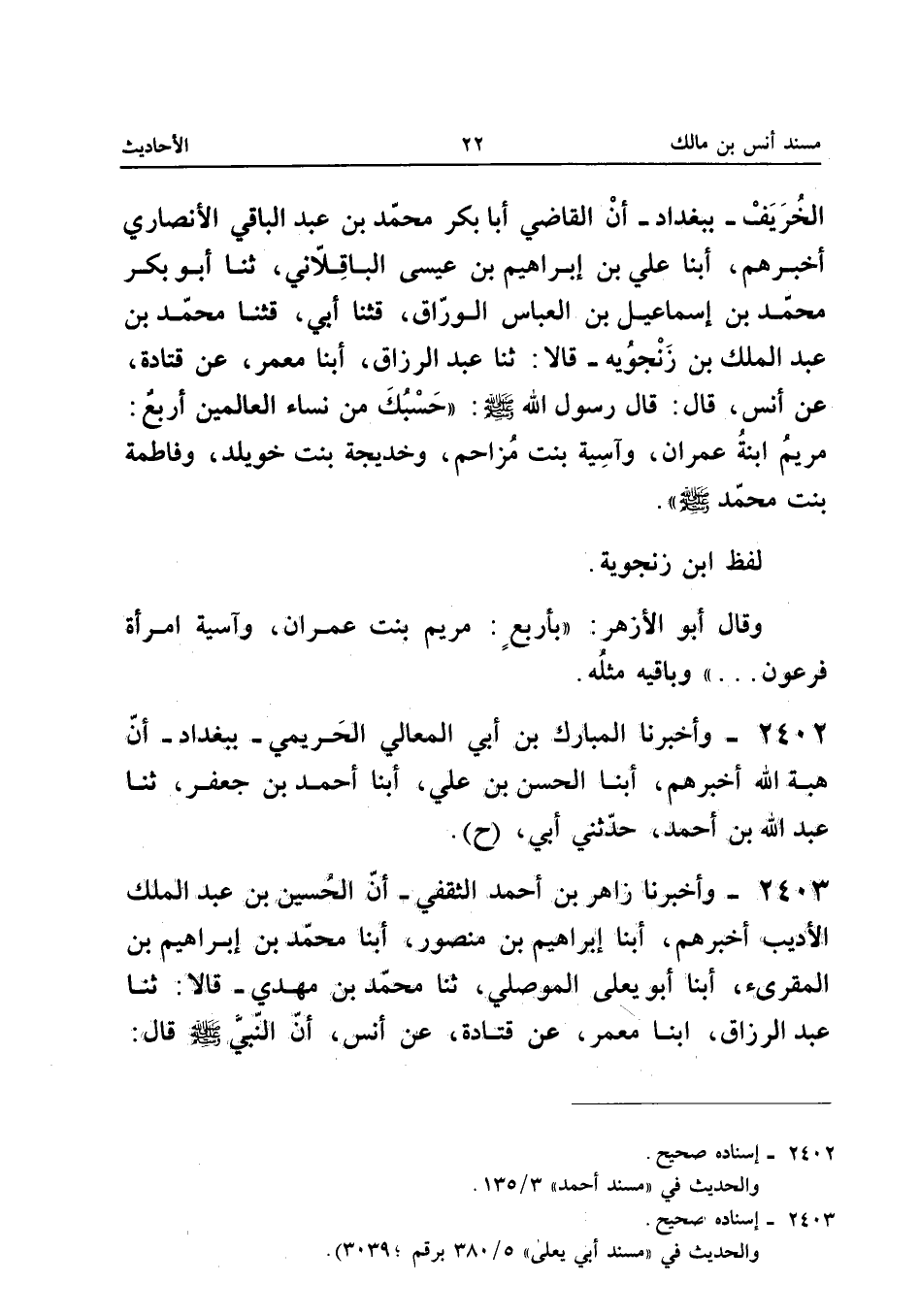 لَفْظُ ابْنِ زَنْجُوَيْهِ وَقَالَ أَبُو الأَزْهَرِ بِأَرْبَعٍ مَرْيَمُ بِنْتُ عِمْرَانَ وآسية امْرَأَة فِرْعَوْن وَبَاقِيه مثله إِسْنَاده صَحِيح