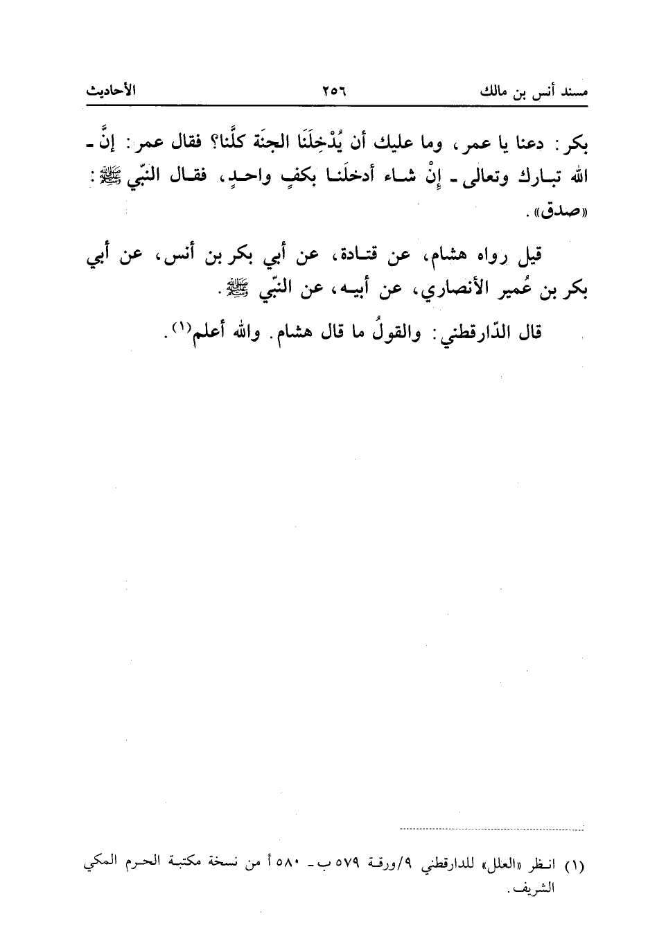 قِيلَ رَوَاهُ هِشَامٌ عَنْ قَتَادَةَ عَنْ أَبِي بَكْرِ بْنِ أَنَسٍ عَنْ أَبِي بَكْرِ بْنِ عُمَيْرٍ الأَنْصَارِيِّ عَنْ أَبِيهِ عَنِ النَّبِيِّ صَلَّى اللَّهُ عَلَيْهِ وَسَلَّمَ قَالَ الدَّارَقُطْنِيُّ وَالْقَوْلُ مَا قَالَ هِشَامٌ وَاللَّهُ أَعْلَمُ