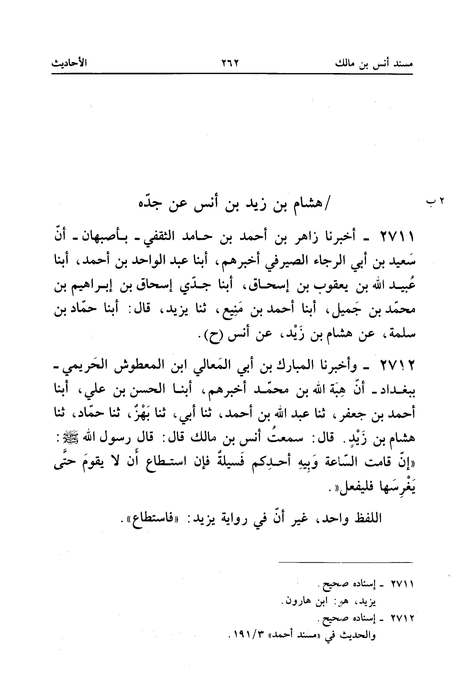 2712 - وَأخْبرنَا الْمُبَارك بن أبي الْمَعَالِي ابْن الْمَعْطُوشِ الْحَرِيمِيُّ بِبَغْدَادَ أَنَّ هِبَةَ اللَّهِ بْنَ مُحَمَّدٍ أَخْبَرَهُمْ أبنا الْحَسَنُ بْنُ عَلِيٍّ أبنا أَحْمَدُ بْنُ جَعْفَرٍ ثَنَا عَبْدُ اللَّهِ بْنُ أَحْمَدَ ثَنَا أَبِي ثَنَا بَهْزٌ ثَنَا حَمَّادٌ ثَنَا هِشَامُ بْنُ زَيْدٍ قَالَ سَمِعْتُ أَنَسَ بْنِ مَالِكٍ قَالَ قَالَ رَسُولُ اللَّهِ صَلَّى الله عَلَيْهِ وَسلم إِن قَامَت السَّاعَة وبيه أَحَدِكُمْ فَسِيلَةٌ فَإِنِ اسْتَطَاعَ أَنْ لَا يَقُومَ حَتَّى يَغْرِسَهَا فَلْيَفْعَلْ