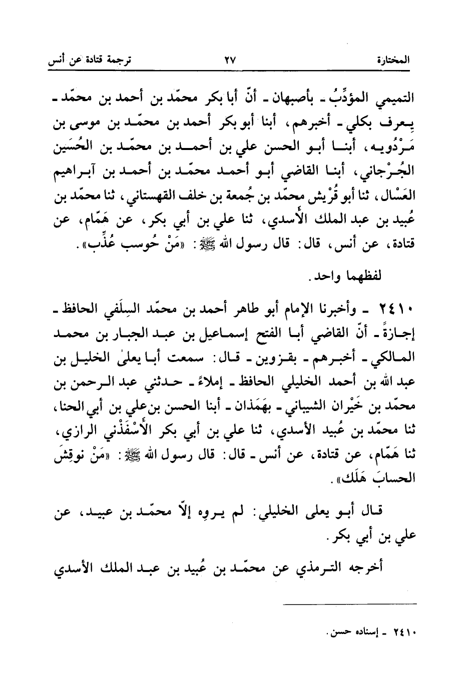 2410 - وَأَخْبَرَنَا الإِمَامُ أَبُو طَاهِرٍ أَحْمَدُ بْنُ مُحَمَّدٍ السِّلَفِيُّ الْحَافِظُ إِجَازَةً أَنَّ الْقَاضِي أَبَا الْفَتْحِ إِسْمَاعِيلَ بْنَ عَبْدِ الْجَبَّارِ بْنِ مُحَمَّدٍ الْمَالِكِيَّ أَخْبَرَهُمْ بِقَزْوِينَ قَالَ سَمِعْتُ أَبَا يَعْلَى الْخَلِيلَ بْنَ عَبْدِ اللَّهِ بْنِ أَحْمَدَ الْخَلِيلِيَّ الْحَافِظَ إِمْلاءً حَدَّثَنِي عَبْدُ الرَّحْمَنِ بْنُ مُحَمَّدِ بْنِ خَيْرَانَ الشَّيْبَانِيُّ بِهَمَذَانَ أبنا الْحَسَنُ بْنُ عَلِيِّ بْنِ أَبِي الْحِنَّا ثَنَا مُحَمَّدُ بْنُ عُبَيْدٍ الأَسَدِيُّ ثَنَا عَلِيُّ بْنُ أَبِي بَكْرٍ الإِسْفَذَنِيُّ الرَّازِيُّ ثَنَا هَمَّامٌ عَنْ قَتَادَةَ عَنْ أَنَسٍ قَالَ قَالَ رَسُولُ اللَّهِ صَلَّى اللَّهُ عَلَيْهِ وَسَلَّمَ مَنْ نُوقِشَ الْحِسَابَ هَلَكَ