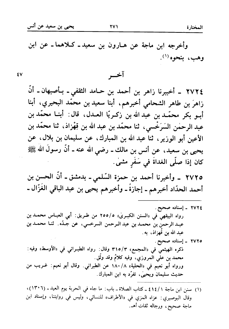 2724 - أَخْبَرَنَا زَاهِرُ بْنُ أَحْمَدَ بْنِ حَامِدٍ الثَّقَفِيُّ بِأَصْبَهَانَ أَنَّ زَاهِرَ بْنَ طَاهِرٍ الشَّحَّامِيَّ أَخْبَرَهُمْ أبنا سَعِيدُ بْنُ مُحَمَّدٍ الْبَحِيرِيُّ أبنا أَبُو بَكْرٍ مُحَمَّدُ بْنُ عَبْدِ اللَّهِ بْنِ زَكَرِيَّا الْعَدْلُ قَالَ أبنا مُحَمَّدُ بْنُ عَبْدِ الرَّحْمَنِ السَّرَخْسِيُّ ثَنَا مُحَمَّدُ بْنُ عَبْدِ اللَّهِ بْنِ قُهْزَاذَ ثَنَا مُحَمَّدُ بْنُ الأَعْيَنِ أَبُو الْوَزِيرِ ثَنَا عَبْدُ اللَّهِ بْنُ الْمُبَارَكِ عَنْ سُلَيْمَانَ بْنُ بِلالٍ عَنْ يَحْيَى بْنِ سَعِيدٍ عَنْ أَنَسِ بْنِ مَالِكٍ رَضِيَ اللَّهُ عَنْهُ أَنَّ رَسُولَ اللَّهِ صَلَّى اللَّهُ عَلَيْهِ وَسَلَّمَ كَانَ إِذا صلى الْغَدَاة فِي سفر مَشى إِسْنَاده صَحِيح