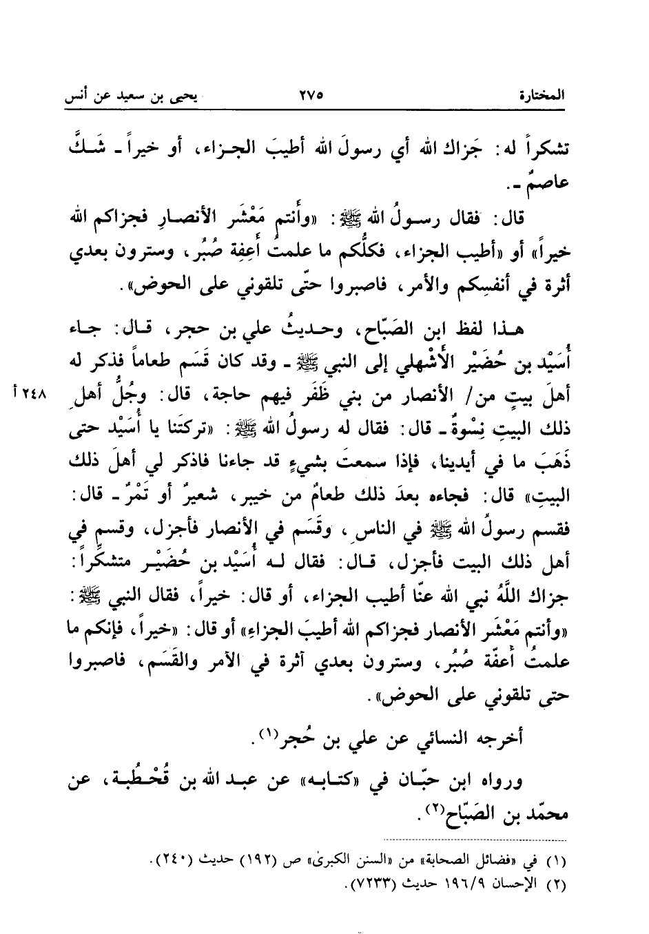 هَذَا لَفْظُ ابْنِ الصَّبَّاحِ وَحَدِيثُ عَلِيِّ بْنِ حُجْرٍ قَالَ جَاءَ أُسَيْدُ بْنُ حُضَيْرٍ الأَشْهَلِيُّ إِلَى النَّبِيِّ صَلَّى اللَّهُ عَلَيْهِ وَسَلَّمَ وَقَدْ كَانَ قَسَمَ طَعَامًا فَذَكَرَ لَهُ أَهْلَ بَيْتٍ مِنَ الأَنْصَارِ مِنْ بَنِي ظَفْرٍ فِيهِمْ حَاجَةٌ قَالَ وَجُلُّ أَهْلِ ذَلِكَ الْبَيْتِ نِسْوَةٌ قَالَ فَقَالَ لَهُ رَسُولُ اللَّهِ صَلَّى اللَّهُ عَلَيْهِ وَسَلَّمَ تَرَكْتَنَا يَا أُسَيْدُ حَتَّى ذَهَبَ مَا فِي أَيْدِينَا فَإِذَا سَمِعْتَ بِشَيْءٍ قَدْ جَاءَنَا فَاذْكُرْ لِي أَهْلَ ذَلِكَ الْبَيْتِ قَالَ فَجَاءَهُ بَعْدَ ذَلِكَ طَعَامٌ مِنْ خَيْبَرَ شَعِيرٌ أَوْ تَمْرٌ قَالَ فَقَسَمَ رَسُولَ اللَّهِ صَلَّى اللَّهُ عَلَيْهِ وَسَلَّمَ فِي النَّاسِ وَقَسَمَ فِي الأَنْصَارِ فَأَجْزَلَ وَقَسَمَ فِي أَهْلِ ذَلِكَ الْبَيْتِ فَأَجْزَلَ قَالَ فَقَالَ لَهُ أُسَيْدُ بْنُ حُضَيْرٍ مُتَشَكِّرًا جَزَاكَ اللَّهُ نَبِيَّ اللَّهِ عَنَّا أَطْيَبَ الْجَزَاءِ أَوْ قَالَ خَيْرًا فَقَالَ النَّبِيُّ صَلَّى اللَّهُ عَلَيْهِ وَسَلَّمَ وَأَنْتُمْ مَعْشَرَ الأَنْصَارِ فَجَزَاكُمُ اللَّهُ أَطْيَبَ الْجَزَاءِ أَوْ قَالَ خَيْرًا فَإِنَّكُمْ مَا عَلِمْتُ أَعِفَّةَ صَبْرٍ وَسَتَرَوْنَ بَعْدِي أَثَرَةً فِي الأَمْرِ وَالْقَسْمِ فَاصْبِرُوا حَتَّى تَلْقَوْنِي عَلَى الْحَوْضِ