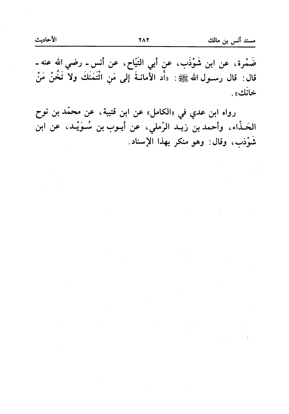 رَوَاهُ ابْنُ عَدِيٍّ فِي الْكَامِلِ عَنِ ابْنِ قُتَيْبَةَ عَنْ مُحَمَّدِ بْنِ نُوحٍ الْحَذَّاءِ وَأَحْمَدَ بْنِ زَيْدٍ الرَّمْلِيِّ عَنْ أَيُّوبَ بْنِ سُوَيْدٍ عَنِ ابْنِ شَوْذَبٍ وَقَالَ وَهُوَ مُنْكَرٌ بِهَذَا الإِسْنَادِ