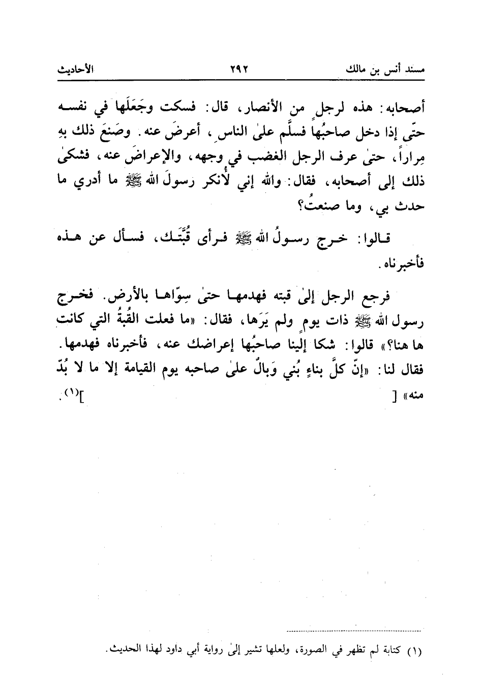 أَصْحَابُهُ هَذِهِ لِرَجُلٍ مِنَ الأَنْصَارِ قَالَ فَسَكَتَ وَجَعَلَهَا فِي نَفْسِهِ حَتَّى إِذَا دَخَلَ صَاحِبُهَا فَسَلَّمَ عَلَى النَّاسِ أَعْرَضَ عَنْهُ وَصَنَعَ ذَلِكَ بِهِ مِرَارًا حَتَّى عَرَفَ الرَّجُلُ الْغَضَبَ فِي وَجهه والإعراض عَنهُ فَشكى ذَلِكَ إِلَى أَصْحَابِهِ فَقَالَ وَاللَّهِ إِنِّي لأُنْكِرَ رَسُولَ اللَّهِ صَلَّى اللَّهُ عَلَيْهِ وَسَلَّمَ مَا أَدْرِي مَا حَدَثَ بِي وَمَا صَنَعْتُ قَالُوا خَرَجَ رَسُولُ اللَّهِ صَلَّى اللَّهُ عَلَيْهِ وَسَلَّمَ فَرَأَى قُبَّتَكَ فَسَأَلَ عَنْ هَذِهِ فَأَخْبَرَنَاهُ فَرَجَعَ الرَّجُلُ إِلَى قُبَّتِهِ فَهَدَمَهَا حَتَّى سَوَاهَا بِالأَرْضِ فَخَرَجَ رَسُولُ اللَّهِ صَلَّى اللَّهُ عَلَيْهِ وَسَلَّمَ ذَاتَ يَوْمٍ وَلَمْ يَرَهَا فَقَالَ مَا فَعَلَتِ الْقبَّة الَّتِي كَانَت هَا هُنَا قالو شَكَا إِلَيْنَا صَاحِبُهَا إِعْرَاضَكَ عَنْهُ فَأَخْبَرَنَاهُ فَهَدَمَهَا فَقَالَ لَنَا إِنَّ كُلَّ بِنَاءٍ بُنِيَ وَبَالٌ عَلَى صَاحِبِهِ يَوْمَ الْقِيَامَةِ إِلا مَا لَا بُد مِنْهُ []
