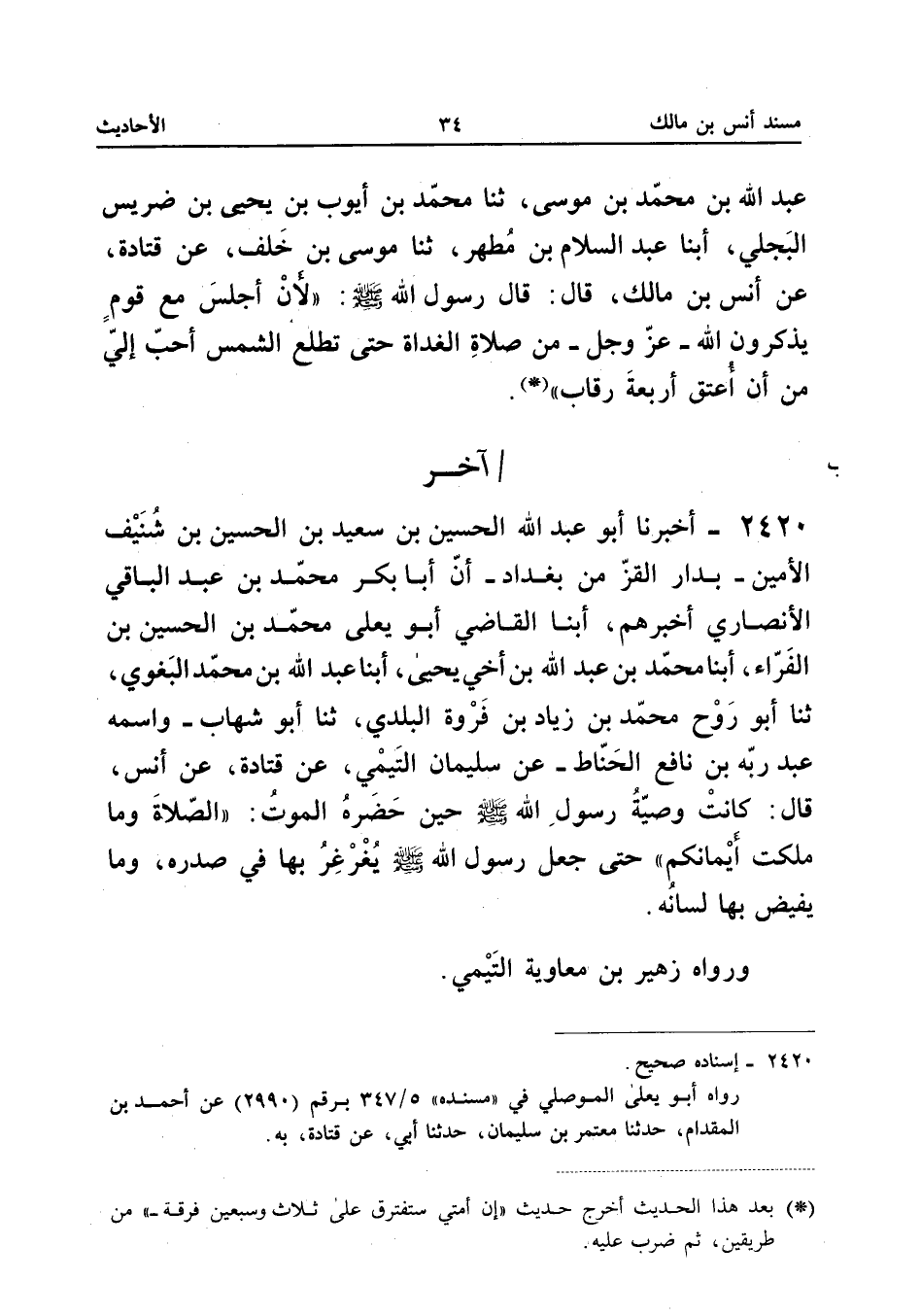 2420 - أَخْبَرَنَا أَبُو عَبْدِ اللَّهِ الْحُسَيْنُ بْنُ سَعِيدِ بْنِ الْحُسَيْنِ بْنِ شُنْيَفٍ الأَمِينُ بِدَارِ الْقَزِّ مِنْ بَغْدَادَ أَنَّ أَبَا بَكْرٍ مُحَمَّدَ بْنَ عَبْدِ الْبَاقِي الأَنْصَارِيَّ أَخْبَرَهُمْ أبنا الْقَاضِي أَبُو يَعْلَى مُحَمَّدُ بْنُ الْحُسَيْنِ بْنِ الْفَرَّاءِ أبنا مُحَمَّد بن عبد الله بن أَخِي يَحْيَى أبنا عَبْدُ اللَّهِ بْنُ مُحَمَّدٍ الْبَغَوِيُّ ثَنَا أَبُو رَوْحٍ مُحَمَّدُ بْنُ زِيَادِ بْنِ فَرْوَةَ الْبَلَدِيُّ ثَنَا أَبُو شِهَابٍ وَاسْمُهُ عَبْدُ رَبِّهِ بْنُ نَافِعٍ الْحَنَّاطُ عَنْ سُلَيْمَانَ التَّيْمِيِّ عَنْ قَتَادَةَ عَنْ أَنَسٍ قَالَ كَانَتْ وَصِيَّةُ رَسُولِ اللَّهِ صَلَّى اللَّهُ عَلَيْهِ وَسَلَّمَ حِينِ حَضَرَهُ الْمَوْتُ الصَّلاةَ وَمَا مَلَكَتْ أَيْمَانُكُمْ حَتَّى جَعَلَ رَسُولُ اللَّهِ صَلَّى اللَّهُ عَلَيْهِ وَسَلَّمَ يُغَرْغِرُ بِهَا فِي صَدْرِهِ وَمَا يَفِيضُ بِهَا لِسَانُهُ