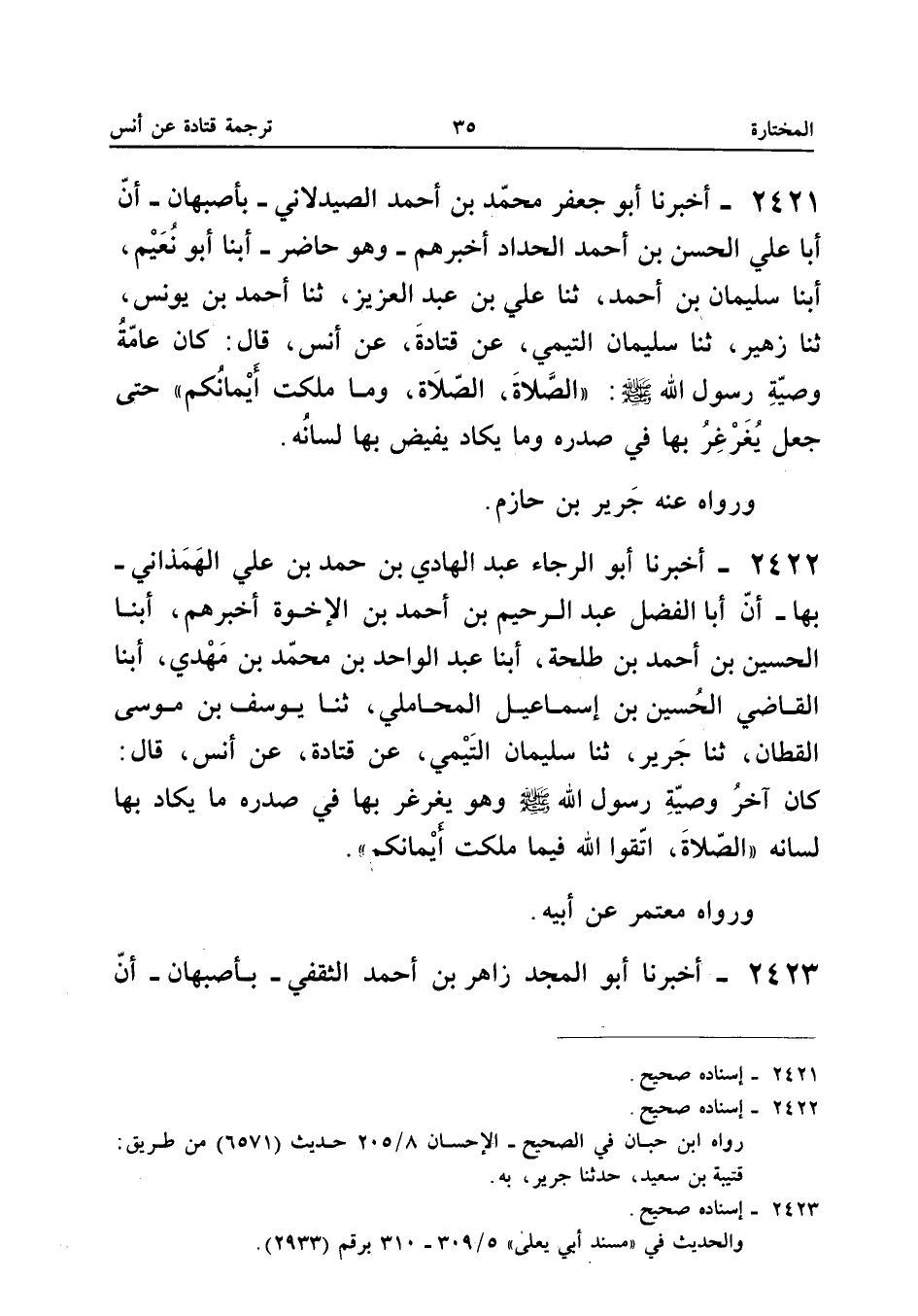 2421 - أَخْبَرَنَا أَبُو جَعْفَرٍ مُحَمَّدُ بْنُ أَحْمَدَ الصَّيْدَلانِيُّ بِأَصْبَهَانَ أَنَّ أَبَا عَلِيٍّ الْحَسَنَ بْنَ أَحْمَدَ الْحَدَّادَ أَخْبَرَهُمْ وَهُوَ حَاضِرٌ أبنا أَبُو نُعَيْمٍ أبنا سُلَيْمَانُ بْنُ أَحْمَدَ ثَنَا عَلِيُّ بْنُ عَبْدِ الْعَزِيزِ ثَنَا أَحْمَدُ بْنُ يُونُسَ ثَنَا زُهَيْرٌ ثَنَا سُلَيْمَانُ التَّيْمِيُّ عَنْ قَتَادَةَ عَنْ أَنَسٍ قَالَ كَانَ عَامَّةُ وَصِيَّةِ رَسُولِ اللَّهِ صَلَّى اللَّهُ عَلَيْهِ وَسَلَّمَ الصَّلاةَ الصَّلاةَ وَمَا مَلَكَتْ أَيْمَانُكُمْ حَتَّى جَعَلَ يُغَرْغِرُ بِهَا فِي صَدْرِهِ وَمَا يَكَادُ يَفِيضُ بِهَا لِسَانُهُ
