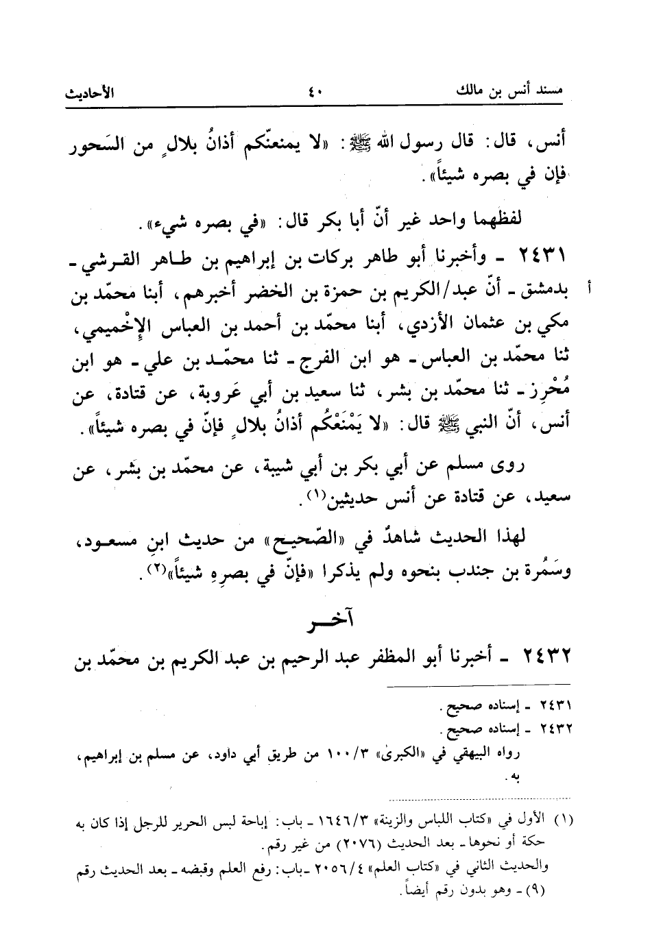 2431 - وأَخْبَرَنَا أَبُو طَاهِرٍ بَرَكَاتُ بْنُ إِبْرَاهِيمَ بْنِ طَاهِرٍ الْقُرَشِيُّ بِدِمَشْقَ أَنَّ عَبْدَ الْكَرِيمِ بْنَ حَمْزَةَ بْنِ الْخَضِرِ أَخْبَرَهُمْ أبنا مُحَمَّدُ بْنُ مَكِّيِّ بْنِ عُثْمَانَ الأَزْدِيُّ أبنا مُحَمَّدُ بْنُ أَحْمَدَ بْنِ الْعَبَّاسِ الإِخْمِيمِيُّ ثَنَا مُحَمَّدُ بْنُ الْعَبَّاسِ هُوَ ابْنُ الْفَرَجِ ثَنَا مُحَمَّدُ بْنُ عَلِيٍّ هُوَ ابْنُ مُحْرِزٍ ثَنَا مُحَمَّدُ بْنُ بِشْرٍ ثَنَا سَعِيدُ بْنُ أَبِي عَرُوبَةَ عَنْ قَتَادَةَ عَنْ أَنَسٍ أَنَّ النَّبِيَّ صَلَّى اللَّهُ عَلَيْهِ وَسَلَّمَ قَالَ لَا يَمْنَعْكُمْ أَذَانُ بِلالٍ فَإِنَّ فِي بَصَرِهِ شَيْئًا