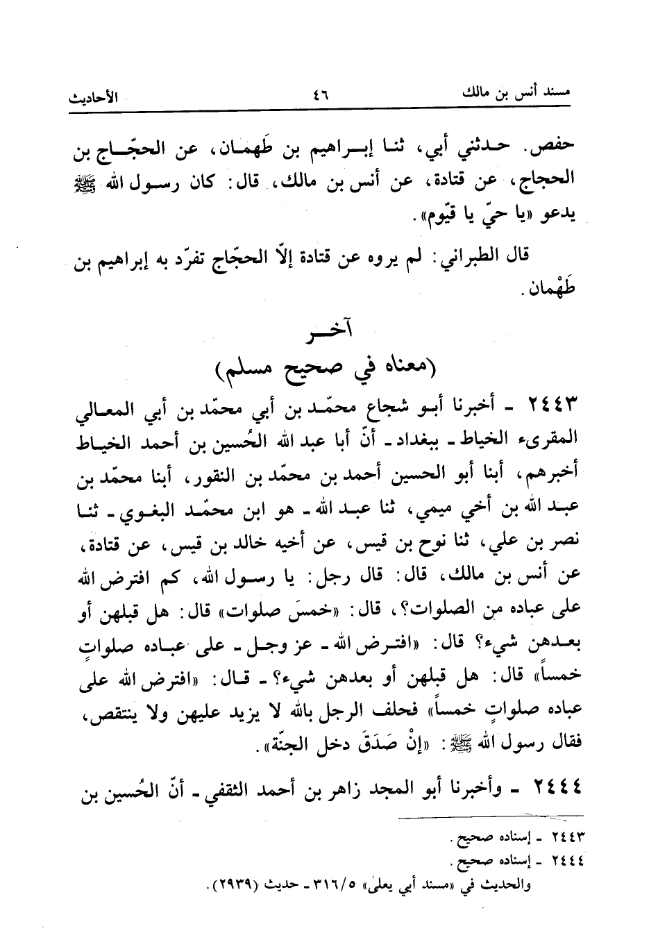 2443 - أَخْبَرَنَا أَبُو شُجَاعٍ مُحَمَّدُ بْنُ أَبِي مُحَمَّدِ بْنِ أَبِي الْمَعَالِي الْمُقْرِئُ الْخَيَّاطُ بِبَغْدَادَ أَنَّ أَبَا عَبْدِ اللَّهِ الْحُسَيْنَ بْنَ أَحْمَدَ الْخَيَّاطَ أَخْبَرَهُمْ أبنا أَبُو الْحُسَيْنِ أَحْمَدُ بْنُ مُحَمَّدِ بْنِ النَّقُّورِ أبنا مُحَمَّدُ بْنُ عَبْدِ اللَّهِ بن أَخِي مِيمِي ثَنَا عَبْدُ اللَّهِ هُوَ ابْنُ مُحَمَّدٍ الْبَغَوِيُّ ثَنَا نَصْرُ بْنُ عَلِيٍّ ثَنَا نُوحُ بْنُ قَيْسٍ عَنْ أَخِيهِ خَالِدِ بْنِ قَيْسٍ عَنْ قَتَادَةَ عَنْ أَنَسِ بْنِ مَالِكٍ قَالَ قَالَ رَجُلٌ يَا رَسُولَ اللَّهِ كَمِ افْتَرَضَ اللَّهُ عَلَى عِبَادِهِ مِنَ الصَّلَوَاتِ قَالَ خَمْسَ صَلَوَاتٍ قَالَ هَلْ قَبْلَهُنَّ أَوْ بَعْدَهُنَّ شَيْءٌ قَالَ افْتَرَضَ اللَّهُ عَزَّ وَجَلَّ عَلَى عِبَادِهِ صَلَوَاتٍ خَمْسًا قَالَ هَلْ قَبْلَهُنَّ أَوْ بَعْدَهُنَّ شَيْءٌ قَالَ افْتَرَضَ اللَّهُ عَلَى عِبَادِهِ صَلَوَاتٍ خَمْسًا فَحَلَفَ الرَّجُلُ بِاللَّهِ لَا يَزِيدُ عَلَيْهِنَّ وَلا يَنْتَقِصُ فَقَالَ رَسُولُ اللَّهِ صَلَّى اللَّهُ عَلَيْهِ وَسَلَّمَ إِنْ صَدَقَ دَخَلَ الْجَنَّةَ إِسْنَاده صَحِيح
