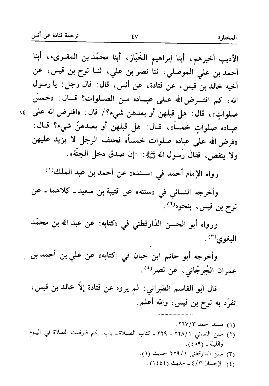 رَوَاهُ الإِمَامُ أَحْمَدُ فِي مُسْنَدِهِ عَنْ أَحْمَدَ بْنِ عَبْدِ الْمَلِكِ وَأَخْرَجَهُ النَّسَائِيُّ فِي سُنَنِهِ عَنْ قُتَيْبَةَ بْنِ سَعِيدٍ كِلاهُمَا عَنْ نُوحِ بْنِ قَيْسٍ بِنَحْوِهِ وَرَوَاهُ أَبُو الْحَسَنِ الدَّارَقُطْنِيُّ فِي كِتَابِهِ عَنْ عَبْدِ اللَّهِ بْنِ مُحَمَّدٍ الْبَغَوِيِّ وَأَخْرَجَهُ أَبُو حَاتِمِ ابْنُ حِبَّانَ فِي كِتَابِهِ عَنْ عَلِيِّ بْنِ أَحْمَدَ بْنِ عِمْرَانَ الْجُرْجَانِيِّ عَنْ نَصْرٍ قَالَ أَبُو الْقَاسِمِ الطَّبَرَانِيُّ لَمْ يَرْوِهِ عَنْ قَتَادَةَ إِلا خَالِدُ بْنُ قَيْسٍ تَفَرَّدَ بِهِ نُوحُ بْنُ قَيْسٍ وَالله أعلم