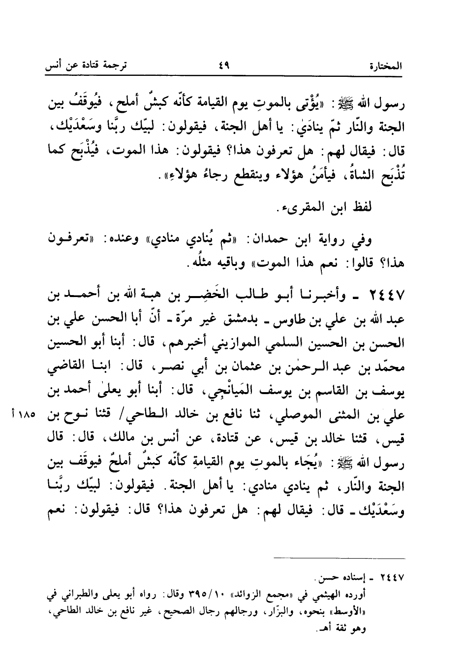 2447 - وَأَخْبَرَنَا أَبُو طَالِبٍ الْخَضِرُ بْنُ هِبَةِ اللَّهِ بْنِ أَحْمَدَ بْنِ عَبْدِ اللَّهِ بْنِ عَلِيِّ بْنِ طَاوُسٍ بِدِمَشْقَ غَيْرَ مَرَّةٍ أَنَّ أَبَا الْحَسَنِ عَلِيُّ بْنُ الْحَسَنِ بْنِ الْحُسَيْنِ السُّلَمِيُّ الْمَوَازِينِيَّ أَخْبَرَهُمْ قَالَ أبنا أَبُو الْحُسَيْنِ مُحَمَّدُ بْنُ عَبْدِ الرَّحْمَنِ بْنِ عُثْمَانَ بْنِ أَبِي نَصْرٍ قَالَ أبنا الْقَاضِي يُوسُفُ بْنُ الْقَاسِمِ بْنِ يُوسُفَ الْمَيَانِجِيُّ قَالَ أبنا أَبُو يَعْلَى أَحْمَدُ بْنُ عَلِيِّ بْنِ الْمُثَنَّى الْمَوْصِلِيُّ ثَنَا نَافِعُ بْنُ خَالِدٍ الطَّاحِيُّ قثنا نُوحُ بْنُ قَيْسٍ قثنا خَالِدُ بْنُ قَيْسٍ عَنْ قَتَادَةَ عَنْ أَنَسِ بْنِ مَالِكٍ قَالَ قَالَ رَسُولُ اللَّهِ صَلَّى اللَّهُ عَلَيْهِ وَسَلَّمَ يُجَاءُ بِالْمَوْتِ يَوْمَ الْقِيَامَةِ كَأَنَّهُ كَبْشٌ أَمْلَحُ فَيُوقَفُ بَيْنَ الْجنَّة وَالنَّار ثمَّ يُنَادي مُنَادِي يَا أَهْلَ الْجَنَّةِ فَيَقُولُونَ لَبَّيْكَ رَبَّنَا وَسَعْدَيْكَ قَالَ فَيُقَالُ لَهُمْ هَلْ تَعْرِفُونَ هَذَا قَالَ فَيَقُولُونَ نعم