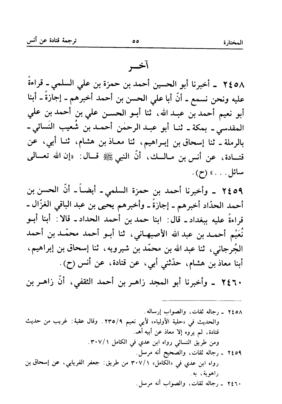 2458 - أَخْبَرَنَا أَبُو الْحُسَيْنِ أَحْمَدُ بْنُ حَمْزَةَ بْنِ عَلِيٍّ السُّلَمِيُّ قِرَاءَةً عَلَيْهِ وَنَحْنُ نَسْمَعُ أَنَّ أَبَا عَلِيٍّ الْحَسَنَ بْنَ أَحْمَدَ أَخْبَرَهُمْ إِجَازَةً أبنا أَبُو نُعَيْمٍ أَحْمَدُ بْنُ عَبْدِ اللَّهِ ثَنَا أَبُو الْحَسَنِ عَلِيُّ بْنُ أَحْمَدَ بْنِ عَلِيٍّ الْمَقْدِسِيُّ بِمَكَّةَ ثَنَا أَبُو عَبْدِ الرَّحْمَنِ أَحْمَدُ بْنُ شُعَيْبٍ النَّسَائِيُّ بِالرَّمْلَةِ ثَنَا إِسْحَاقُ بْنُ إِبْرَاهِيمَ ثَنَا مُعَاذُ بْنُ هِشَامٍ ثَنَا أَبِي عَنْ قَتَادَةُ عَنْ أَنَسِ بْنِ مَالِكٍ أَنَّ النَّبِيَّ صَلَّى اللَّه عَلَيْهِ وَسَلَّمَ قَالَ إِنَّ اللَّهَ تَعَالَى سَائل (ح) رِجَاله ثِقَات وَالصَّحِيح أَنه مُرْسل