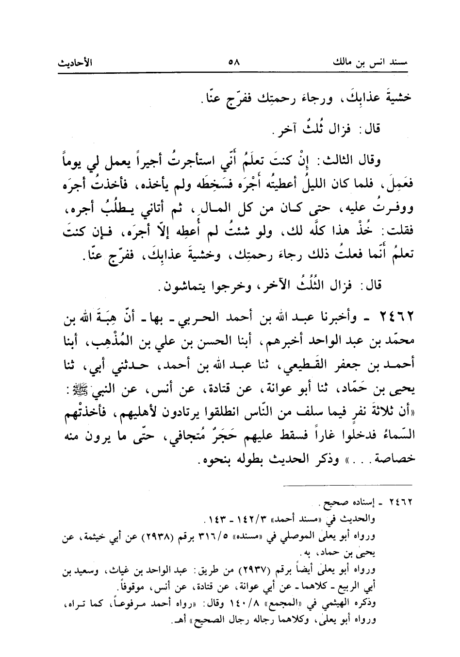 2462 - وَأَخْبَرَنَا عَبْدُ اللَّهِ بْنُ أَحْمَدَ الْحَرْبِيُّ بِهَا أَنَّ هِبَةَ اللَّهِ بْنَ مُحَمَّدِ بْنِ عَبْدِ الْوَاحِدِ أَخْبَرَهُمْ أبنا الْحَسَنُ بْنُ عَلِيِّ بْنِ الْمُذْهِبِ أبنا أَحْمَدُ بْنُ جَعْفَرٍ الْقَطِيعِيُّ ثَنَا عَبْدُ اللَّهِ بْنُ أَحْمَدَ حَدَّثَنِي أَبِي ثَنَا يَحْيَى بْنُ حَمَّادٍ ثَنَا أَبُو عَوَانَةَ عَنْ قَتَادَةَ عَنْ أَنَسٍ عَنِ النَّبِيِّ صَلَّى اللَّهُ عَلَيْهِ وَسَلَّمَ أَنَّ ثَلاثَةَ نَفَرٍ فِيمَا سَلَفَ مِنَ النَّاسِ انْطَلَقُوا يَرْتَادُونَ لأَهْلِيهِمْ فَأَخَذَتْهُمُ السَّمَاءُ فَدَخَلُوا غارا فَسقط عَلَيْهِم حجر متجافي حَتَّى مَا يَرَوْنَ مِنْهُ خَصَاصَةً وَذَكَرَ الْحَدِيثَ بِطُولِهِ بِنَحْوِهِ