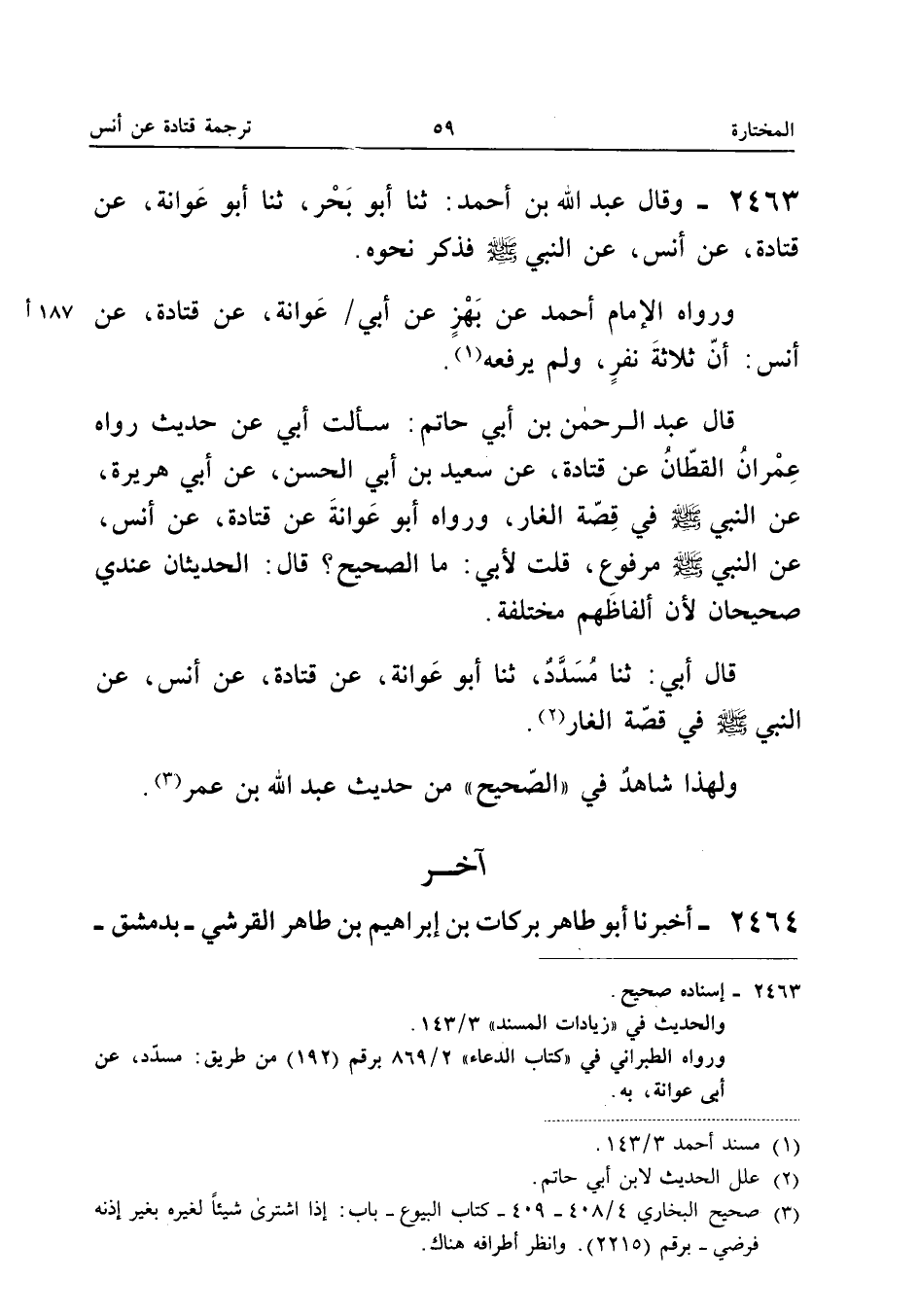 2464 - أَخْبَرَنَا أَبُو طَاهِرٍ بَرَكَاتُ بْنُ إِبْرَاهِيمَ بْنِ طَاهِرٍ الْقُرَشِيُّ بِدِمَشْقَ أَنَّ أَبَا الْحُسَيْنِ عَلِيَّ بْنَ أَحْمَدَ بْنِ مَنْصُورِ بْنِ أَخْبَرَهُمْ أبنا أَبُو نَصْرٍ الْحُسَيْنُ بْنُ مُحَمَّدٍ [] ثَنَا الْحَسَنُ بْنُ يَحْيَى بْنِ السَّكَنِ ثَنَا يَزِيدُ بْنُ هَارُونَ قَالَ أبنا جَرِيرُ بْنُ حَازِمٍ عَنْ قَتَادَة عَن أنس بن مَالك إِسْنَاده صَحِيح