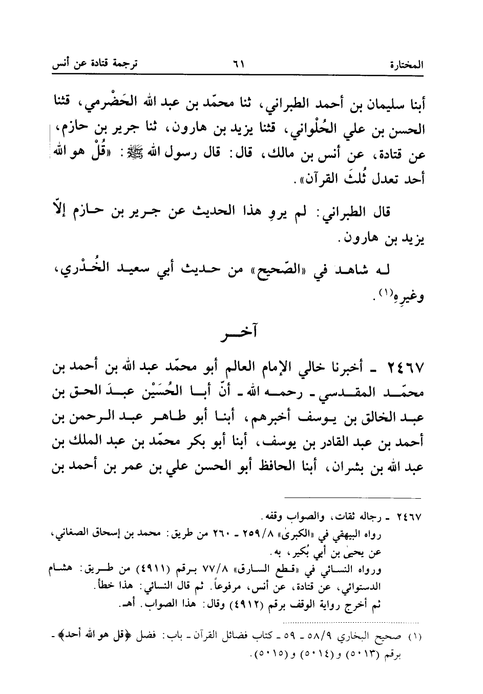 2467 - أَخْبَرَنَا خَالِي الإِمَامُ الْعَالِمُ أَبُو مُحَمَّدٍ عَبْدُ اللَّهِ بْنُ أَحْمَدَ بْنِ مُحَمَّدٍ الْمَقْدِسِيُّ رَحِمَهُ اللَّهُ أَنَّ أَبَا الْحُسَيْنِ عَبْدَ الْحَقِّ بْنَ عَبْدِ الْخَالِقِ بْنِ يُوسُفَ أَخْبَرَهُمْ أبنا أَبُو طَاهِرٍ عَبْدُ الرَّحْمَنِ بْنُ أَحْمَدَ بْنِ عَبْدِ الْقَادِرِ بْنِ يُوسُفَ أبنا أَبُو بَكْرٍ مُحَمَّدُ بْنُ عَبْدِ الْمَلِكِ بْنِ عَبْدِ اللَّهِ بْنِ بِشْرَانَ أبنا الْحَافِظُ أَبُو الْحَسَنِ عَلِيُّ بْنُ عُمَرَ بْنِ أَحْمَدَ بْنِ مَهْدِيٍّ الدَّارَقُطْنِيُّ ثَنَا عَبْدُ اللَّهِ بْنُ أَحْمَدَ بْنِ ثَابِتٍ قَالَ حَدَّثَنِي عِيسَى بْنُ أَبِي حَرْبٍ ثَنَا يَحْيَى بْنُ أَبِي بُكَيْرٍ ثَنَا شُعْبَةُ عَنْ قَتَادَةَ عَنْ أَنَسٍ أَنَّ رَجُلا سَرَقَ مِجَنًّا عَلَى عَهْدِ رَسُولِ اللَّهِ