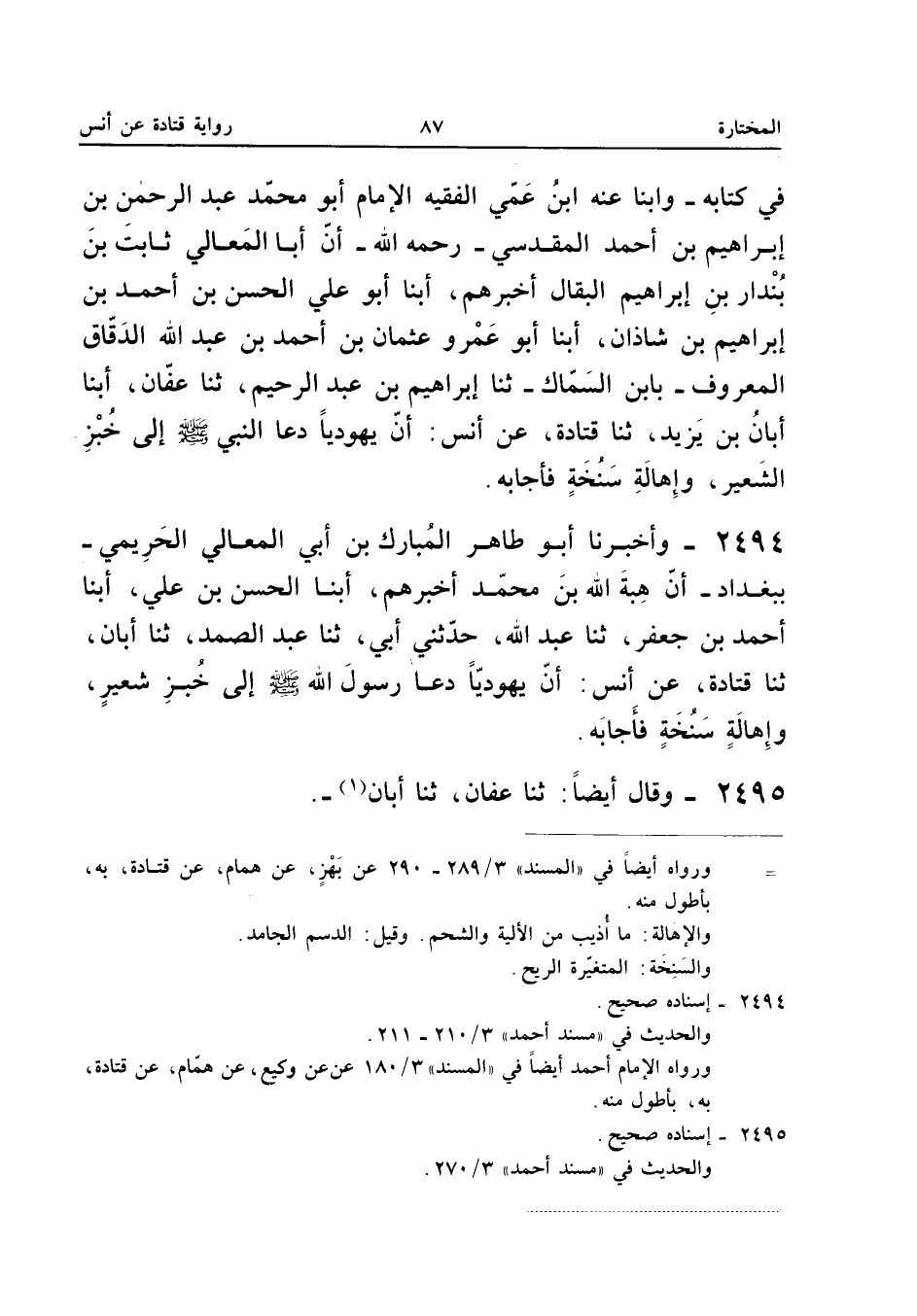 2494 - وَأَخْبَرَنَا أَبُو طَاهِرٍ الْمُبَارَكُ بْنُ أَبِي الْمَعَالِي الْحَرِيمِيُّ بِبَغْدَادَ أَنَّ هِبَةَ اللَّهِ بْنَ مُحَمَّدٍ أَخْبَرَهُمْ أبنا الْحَسَنُ بْنُ عَلِيٍّ أبنا أَحْمَدُ بْنُ جَعْفَرٍ ثَنَا عَبْدُ اللَّهِ حَدَّثَنِي أَبِي ثَنَا عَبْدُ الصَّمَدِ ثَنَا أَبَانٌ ثَنَا قَتَادَةُ عَنْ أَنَسٍ أَنَّ يَهُودِيًّا دَعَا رَسُولَ اللَّهِ صَلَّى اللَّهُ عَلَيْهِ وَسَلَّمَ إِلَى خُبْزِ شَعِيرٍ وإهالة سنخة فَأَجَابَهُ إِسْنَاده صَحِيح