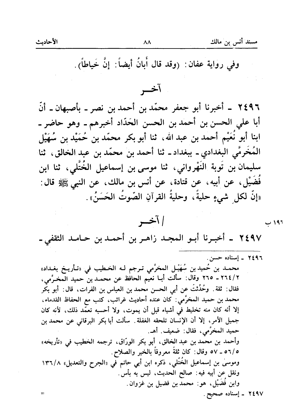 2496 - أَخْبَرَنَا أَبُو جَعْفَرٍ مُحَمَّدُ بْنُ أَحْمَدَ بْنِ نَصْرٍ بِأَصْبَهَانَ أَنَّ أَبَا عَلِيٍّ الْحَسَنَ بْنَ أَحْمَدَ بْنِ الْحَسَنِ الْحَدَّادَ أَخْبَرَهُمْ وَهُوَ حَاضِرٌ أبنا أَبُو نُعَيْمٍ أَحْمَدُ بْنُ عَبْدِ اللَّهِ ثَنَا أَبُو بَكْرٍ مُحَمَّدُ بْنُ حُمَيْدِ بْنِ سُهَيْلٍ الْمُخَرِّمِيُّ الْبَغْدَادِيُّ بِبَغْدَادَ ثَنَا أَحْمَدُ بْنُ مُحَمَّدِ بْنِ عَبْدِ الْخَالِقِ ثَنَا سُلَيْمَانُ بْنُ تَوْبَةَ النَّهْرَوَانِيُّ ثَنَا مُوسَى بْنُ إِسْمَاعِيلَ الْخُتُّلِيُّ ثَنَا ابْنُ فُضَيْلٍ عَنْ أَبِيهِ عَنْ قَتَادَةَ عَنْ أَنَسِ بْنِ مَالِكٍ عَنِ النَّبِيِّ صَلَّى اللَّهُ عَلَيْهِ وَسَلَّمَ قَالَ إِنَّ لِكُلِّ شَيْءٍ حلية وَحلية الْقُرْآن الصَّوْت الْحسن