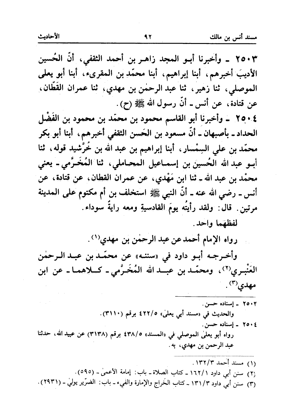 2503 - وَأَخْبَرَنَا أَبُو الْمَجْدِ زَاهِرُ بْنُ أَحْمَدَ الثَّقَفِيُّ أَنَّ الْحُسَيْنَ الأَدِيبَ أَخْبَرَهُمْ أبنا إِبْرَاهِيمُ أبنا مُحَمَّد بن الْمُقْرِئِ أبنا أَبُو يَعْلَى الْمَوْصِلِيُّ ثَنَا زُهَيْرٌ ثَنَا عَبْدُ الرَّحْمَنِ بْنُ مَهْدِيٍّ ثَنَا عِمْرَانُ الْقَطَّانُ عَنْ قَتَادَةَ عَنْ أَنَسٍ أَنَّ رَسُولَ الله صلى الله عَلَيْهِ وَسلم (ح) إِسْنَاده حسن